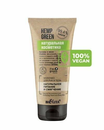 Молочко для тела и кожи рук BELITA натуральная женская косметика увлажняющий питательный уход 150мл.**Концепция упаковки новой линии "Hemp green. Натуральная косметика" включает в себя использование зеленого полиэтилена, который производится из возобновляемого сырья растительного происхождения (бразильского сахарного тростника) и вносит значительный вклад в снижение уровня выбросов парниковых газов в атмосферу.** Откройте для себя это удивительное растение заново, наслаждаясь этим древним ингредиентом, который чудодейственно влияет на кожу. Протеины koнoпли в составе продуктов по уходу за кожей линии "Hemp green. Натуральная косметика": - Уменьшают глубину и длину морщин на 13,9% уже через 14 дней* - Уменьшают шелушение и сухость кожи на 31,9% уже через 14 дней* - Увеличивают увлажненность кожи на 12,7% уже через день* - *Эффективность доказана компанией TRI-K (США).