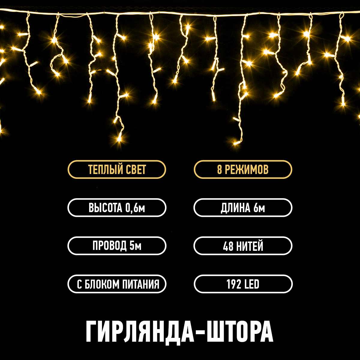 Длина гирлянды дает возможность создавать различные световые композиции. Размер 6 х 0,6 м.