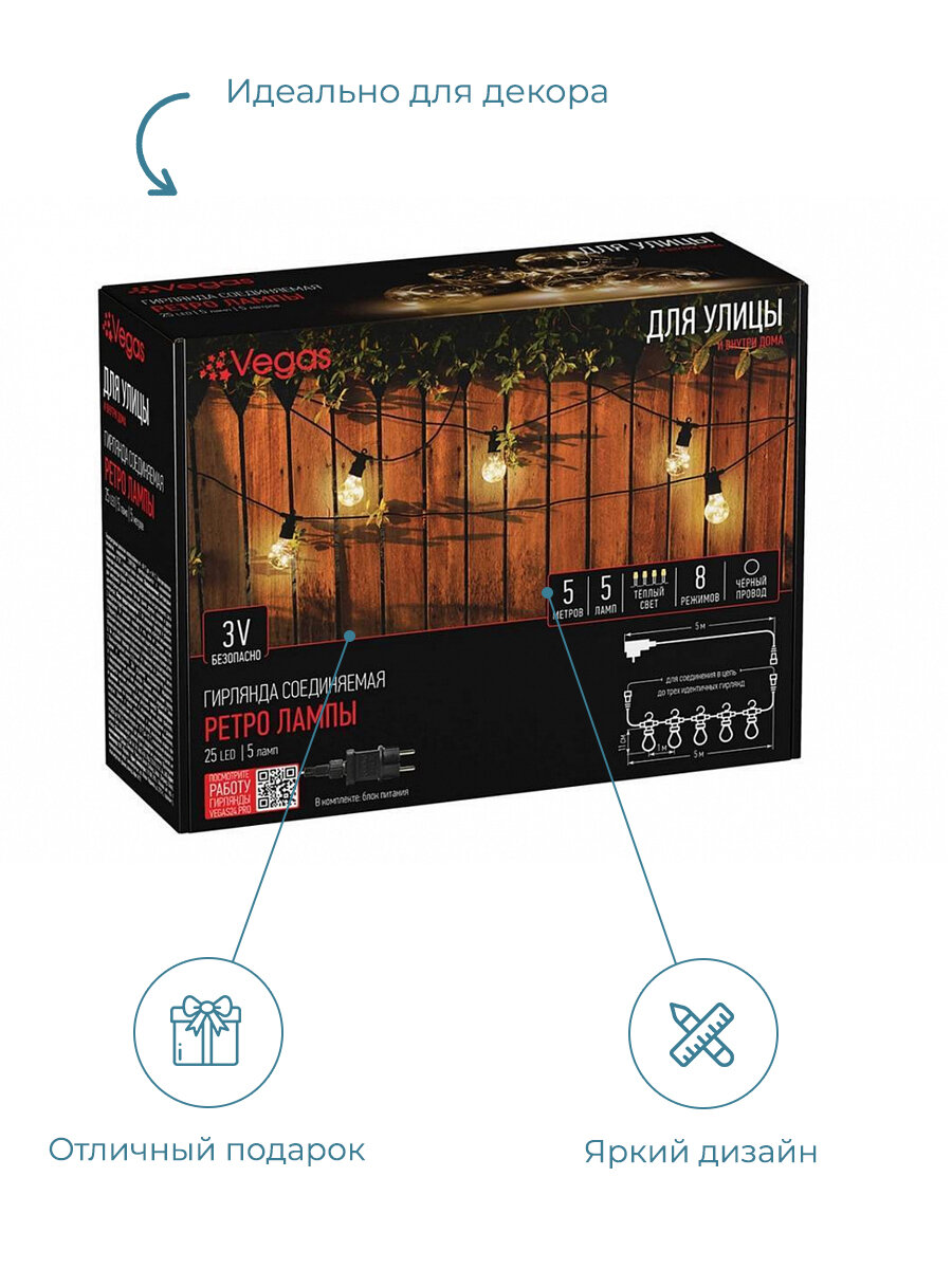 На сегодняшний день товар «Электрогирлянда Vegas Ретро лампы теплый с блоком питания 4.5V 5м Hoff» можно купить с кешбеком в 1 магазине: Яндекс.Маркет