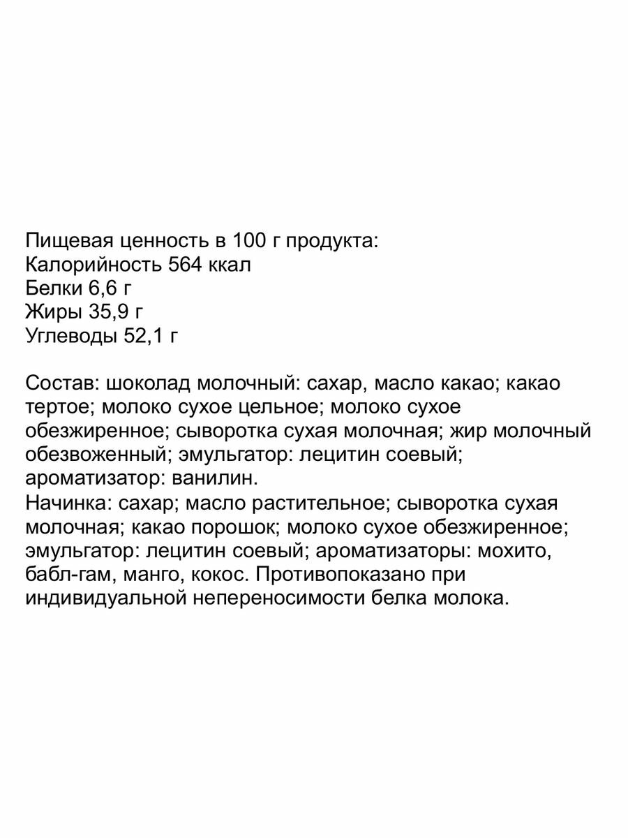 Коллекция конфет из молочного шоколада с 4 нежными начинками: КЛУБНИЧНЫЙ МУСС, ФИСТАШКОВОЕ ПРАЛИНЕ, БАНАНОВОЕ ПАРФЕ, ДЫННЫЙ СОРБЕТ. На внутренней стороне упаковки имеется раскраска с оживающей реальностью.