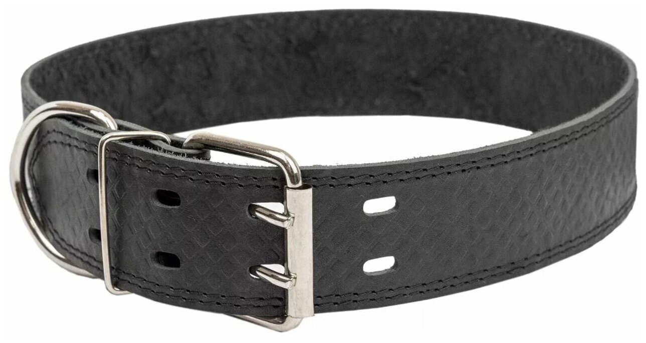 Ошейник для собак изготовлен из тиснёной натуральной шорно-седельной кожи черного цвета. Для крепления поводка в конструкции ошейника имеется металлическое полукольцо, а для заправки кончика установлена металлическая рамка-шлёвка Для собак с обхватом шеи 63-73см.