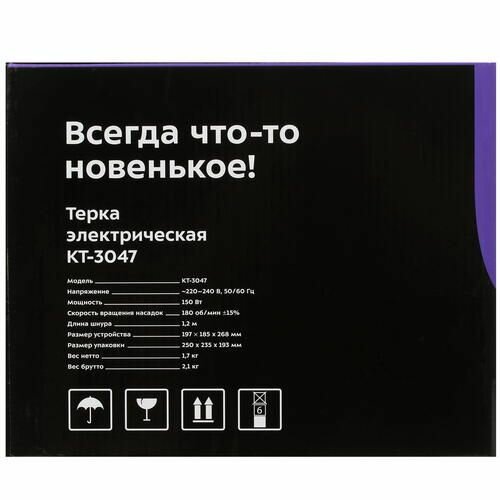 Электрическая компактная тёрка предназначена для тёрки и шинковки овощей, фруктов и других продуктов. Все продукты измельчаются автоматически, при этом контакт ножей тёрки с вашими руками исключён благодаря удобному толкателю. 6 насадок в комплекте.