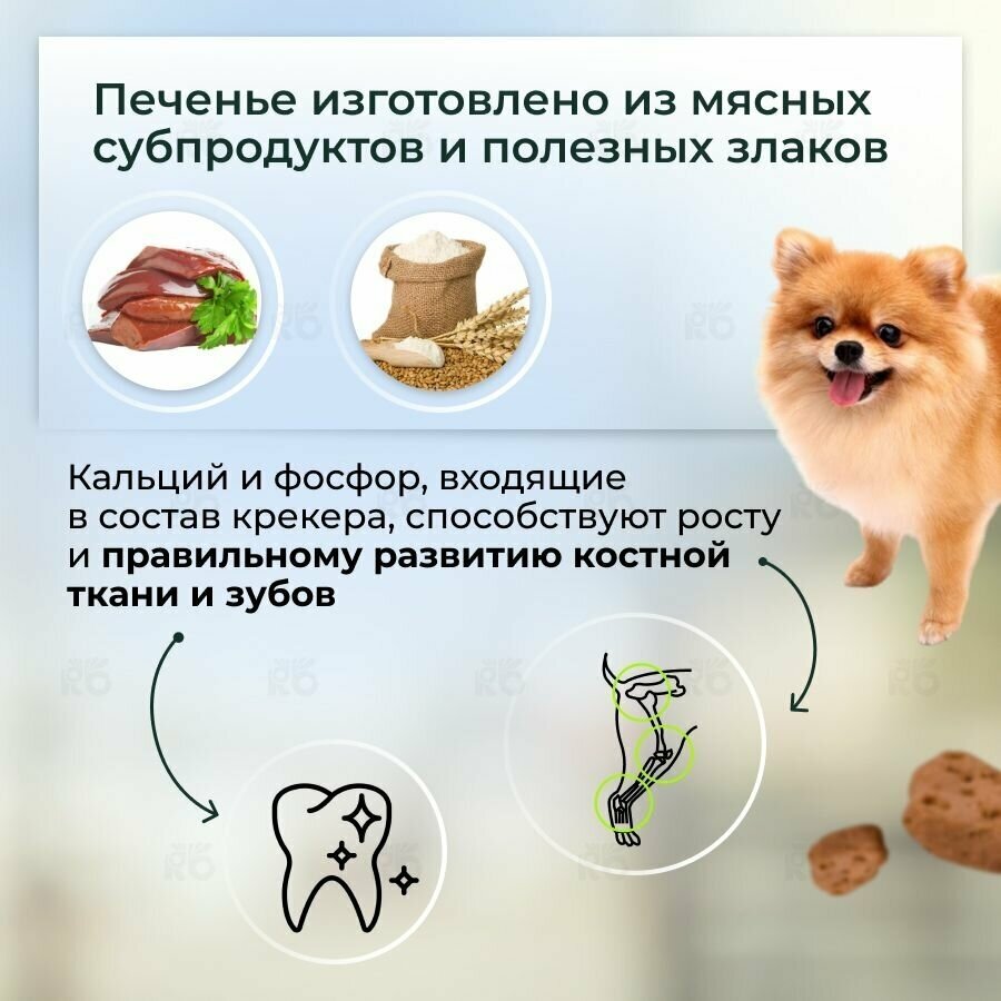 Печенье крекер для собак маленьких и миниатюрных пород, изготовлено из мясных субпродуктов и полезных злаков. Кальций и фосфор, входящие в состав крекера, способствуют росту и правильному развитию костной ткани и зубов.