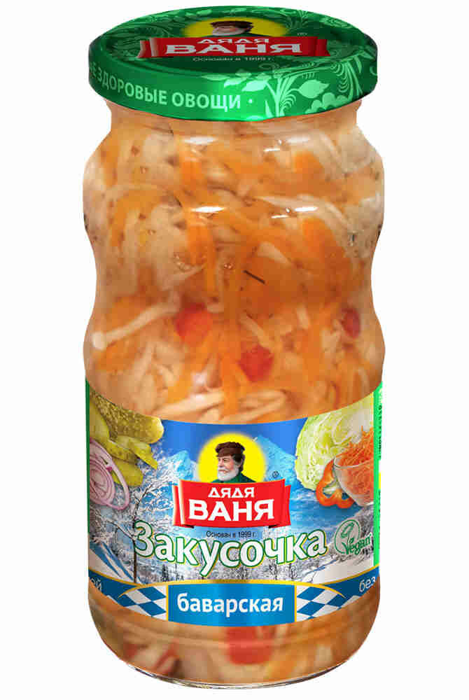 "Дядя Ваня" Баварская закуска - это витаминный салат с капустой, морковкой и хрустящими огурчиками. Закуска не содержит консервантов и красителей. Исключительно натуральный продукт со свежими овощами и зеленью.