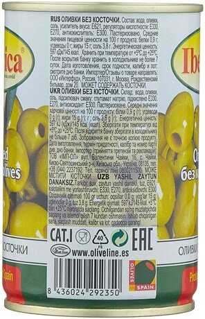 Оливки без косточки IBERICA – изысканный ингредиент средиземноморской кухни, собранных вручную. Оливки богаты витаминами и минералами, являются источником растительных жиров. Более 90% жиров мякоти плодов содержат моно- и полиненасыщенные жирные кислоты. Оливки - одна из самых популярных и любимых нами закусок. Прекрасно сочетается с овощными салатами а также с сырами и другими закусками. Оливки Iberica с любовью выращенные под жарким испанским солнцем станут прекрасным дополнением к вашим любимым блюдам. Оливки используются в рецептах пиццы, пасты, во многих салатах и супах, в составе песто и разнообразных мясных и рыбных блюд, а также канапе и закусках.