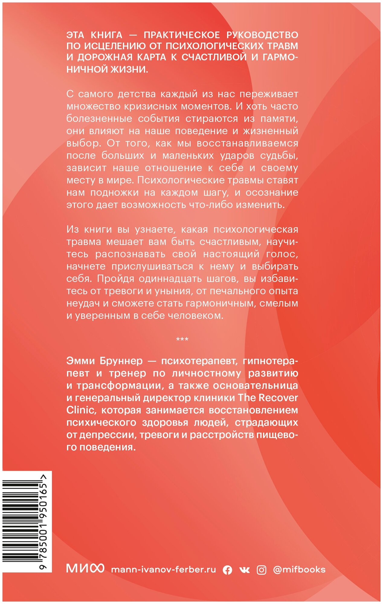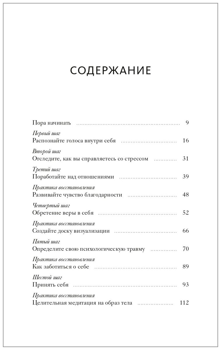 Практическое руководство для поиска и преодоления психологической травмы, которая есть в каждом из нас, и обретению счастья и спокойствия.Негативные образы из прошлого превращаются во внутреннего критика, который мешает нам нормально жить и не дает двигаться вперед. В результате мы вступаем в отношения не с теми людьми, не можем принять собственное тело и считаем, что недостаточно хорошо выглядим, подвержены тревожности и/или депрессии, думаем о себе в уничижительной манере, чувствуем себя потерянными и пытаемся избавиться от этого чувства с помощью алкоголя, переедания или наркотиков, застреваем в деструктивных моделях поведения — и одновременно боимся выхода из этой ситуации и перемен к лучшему.Из книги вы узнаете, как осознать деструктивные паттерны и понять, где именно вы застряли. Автор дает упражнения, которые помогут преодолеть этот деструктив.Книга — сочетание терапевтических исследований, практических советов и 11 инструментов восстановления от психологической травмы.Для кого книга:Для тех, кто хочет избавиться от деструктивных моделей поведения, разобравшись в их истинных причинах.Для тех, кто борется с тревогой, депрессией, негативным образом своего тела.Для тех, кто застрял в деструктивных и токсичных паттернах и циклах.От автора:Пройдя личный путь исцеления от собственной травмы, я создала программу, сочетающую этот опыт с моим клиническим образованием, чтобы дать возможность каждому начать свой процесс исцеления без необходимости обращаться к специалисту. У каждого из нас есть возможность изменить себя, и мне хотелось помочь вам сделать первые шаги к радостным переменам, которые находятся в пределах досягаемости.Пока я преодолевала собственную травму, я научилась использовать определенные инструменты, которые позволили мне развить бережное отношение к себе. Так я обрела уверенность и смелость, чтобы стремиться к жизни, о которой всегда мечтала. Я смогла проникнуться идеей близости и уязвимости в отношениях, начать сосредоточенно и уверенно двигаться к моим карьерным целям и поверить, что я всегда сумею позаботиться о себе, — все это и сейчас мой ориентир.Эта книга для меня — возможность показать вам, как добиться того же. Я написала ее, чтобы поделиться с вами тем, что узнала об исцелении, честности, восстановлении и доброте. Я покажу вам, с чего начать залечивать свои раны, обрести бережное отношение к себе и дать себе право жить той жизнью, о которой вы действительно мечтаете. Вместе мы будем наблюдать, как становится яснее, почему сейчас все именно так, и я покажу вам, как найти практические способы справиться с ситуацией.
