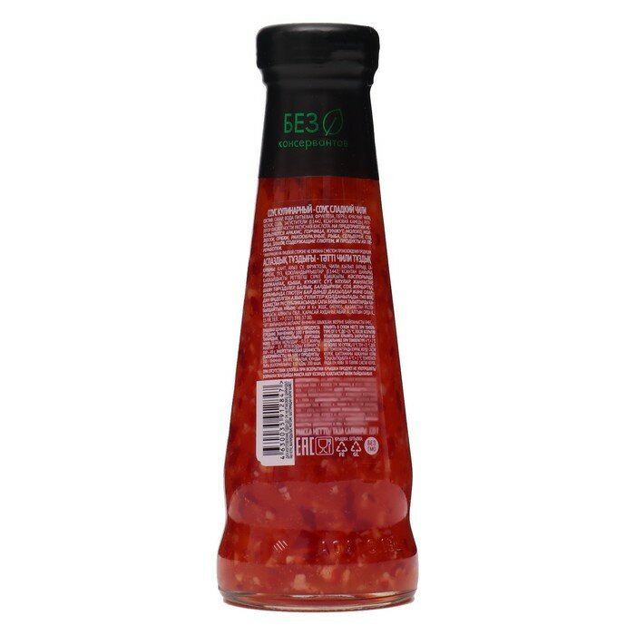 Сведения о составе: сахар, вода питьевая, фруктоза, перец красный чили, чеснок, соль, загустители (Е1442, ксантановая камедь), регулятор кислотности уксусная кислота. На предприятии используются арахис, горчица, кунжут, молоко, моллюски, орехи, ракообразные, рыба, сельдерей, соя, яйца, злаки, содержащие глютен, и продукты их переработки.