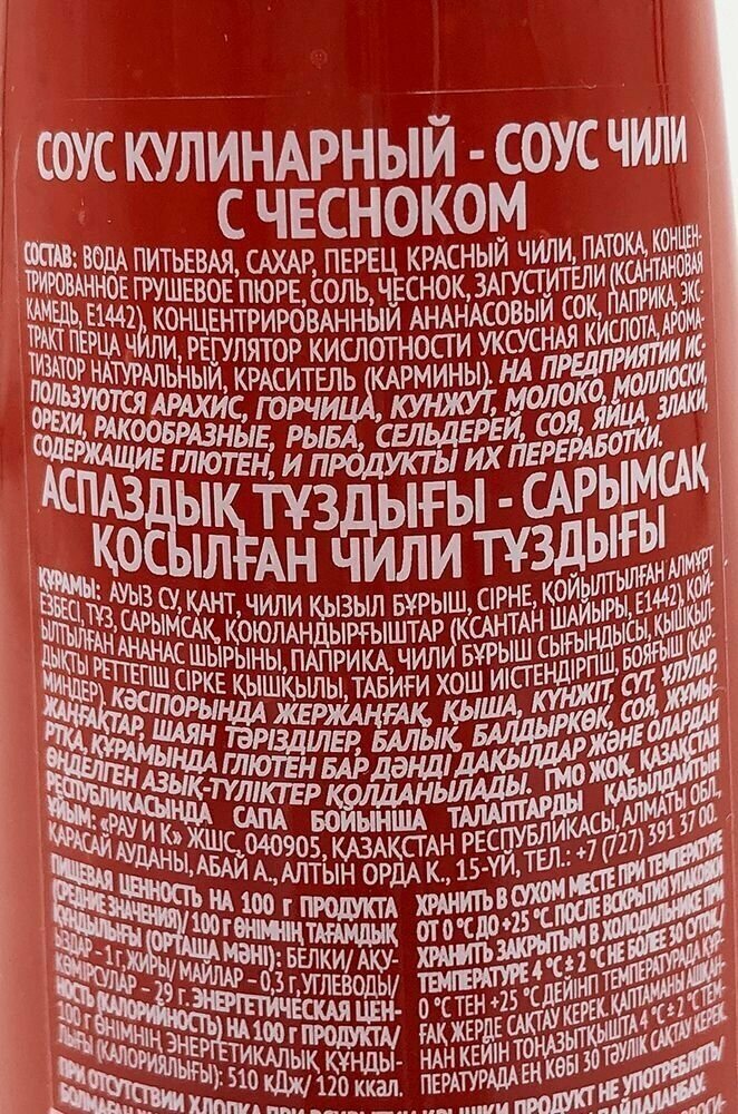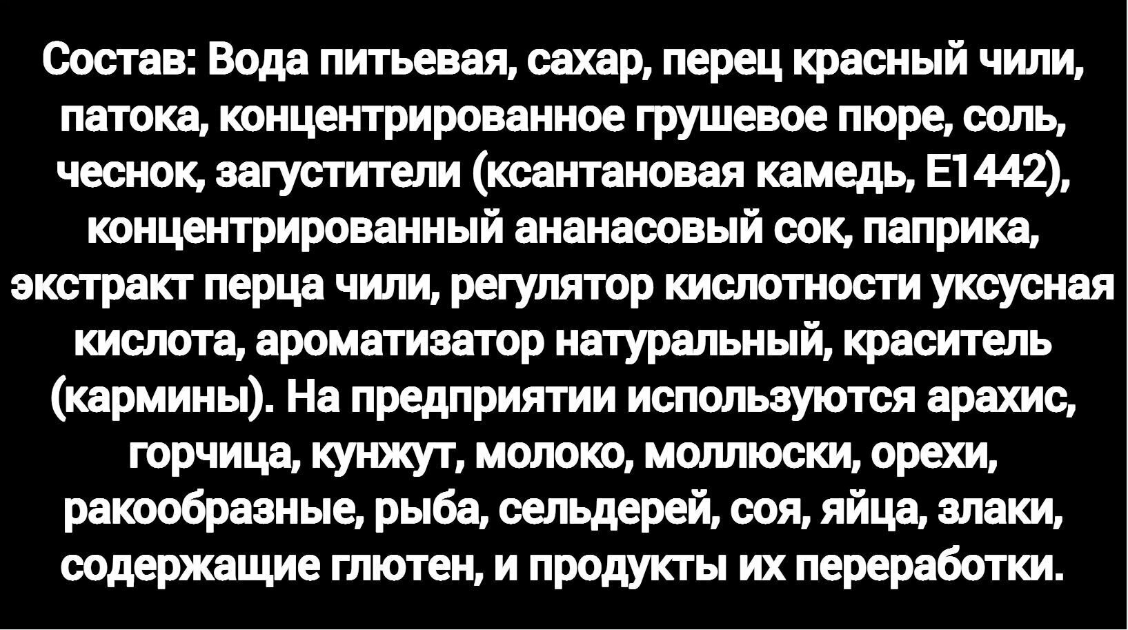 | Состав | Вода питьевая, сахар, перец красный чили, патока, концентрированное грушевое пюре, соль, чеснок, загустители (ксантановая камедь, Е1442), концентрированный ананасовый сок, паприка, экстракт перца чили, регулятор кислотности уксусная кислота, ароматизатор натуральный, краситель (кармины). На предприятии используются арахис, горчица, кунжут, молоко, моллюски, орехи, ракообразные, рыба, сельдерей, соя, яйца, злаки, содержащие глютен, и продукты их переработки. |
