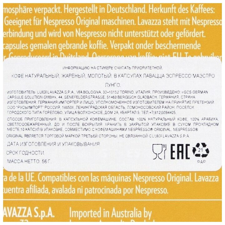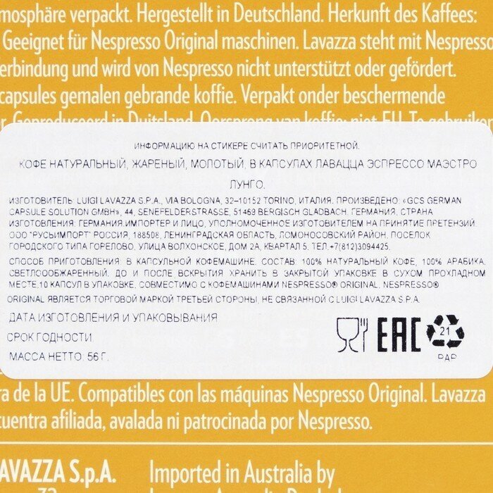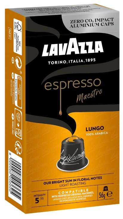 Кофе жаренный молотый в капсулах Lavazza Espresso Maestro Lungo, для Nespresso. Легкая и медленная обжарка и уровень интенсивности 5/13 придают этому кофе сладкий и ароматный вкус для эспрессо с золотистым оттенком.Состав: смесь 100% арабики из Центральной, Южной Америки, Африки и Азии.10 алюминиевых капсул, совместимых с кофемашинами Nespresso Original.