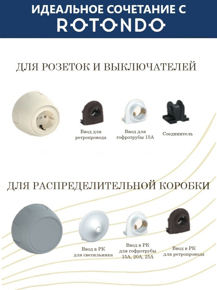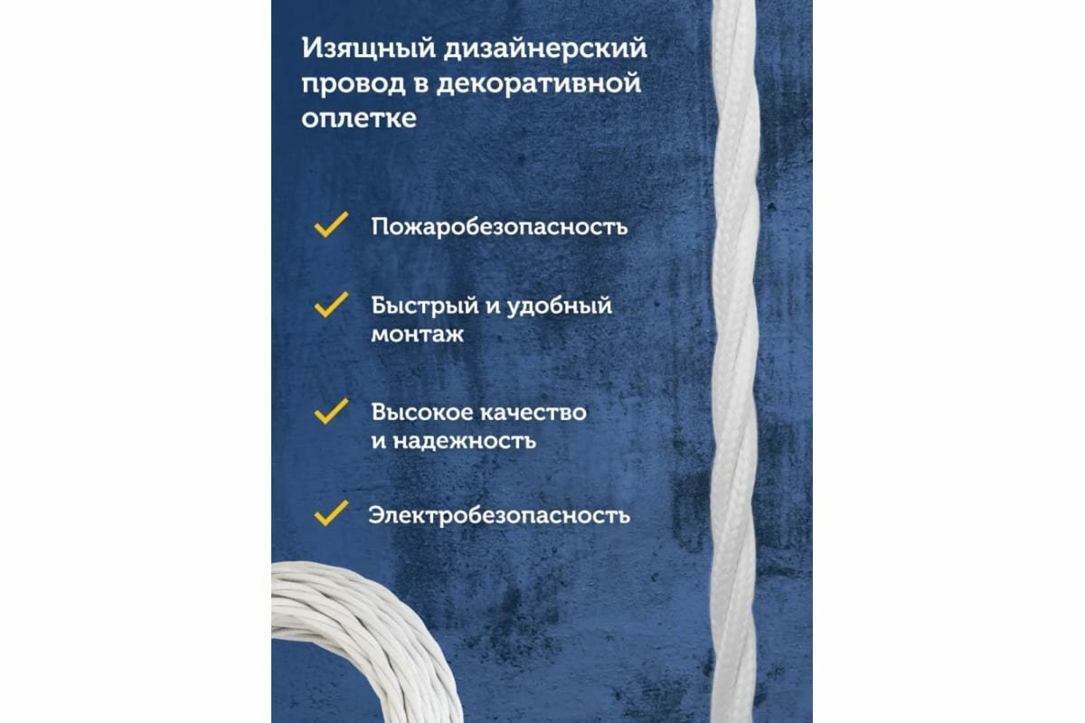 Электропроводка в стиле ретро!Retro Electro — линейка дизайнерских решений для открытой проводки от российского эксперта с 30-летним опытом в области электротехники Группы компаний "ССТ". Семейство включает витые провода в декоративной ретро-оплетке из негорючих полиэфирных нитей в четырех цветах, а также аксессуары, необходимые для монтажа: изоляторы, проходные втулки и распаечные коробки.Двухжильный силовой кабель Retro Electro белого цвета — это качественная, надежная и безопасная проводка. Продукция производится на заводе в Московской области, где тщательным образом проверяется на соответствие нормам и стандартам. Внешняя оболочка из полиэфирных нитей с намоткой высокой плотности — до 90% — и качественная изоляция из современных материалов – все это гарантирует максимальную пожаробезопасность. Для обеспечения электробезопасности при производстве силового кабеля Retro Electro применяется первичная медь с пониженным сопротивлением.Проводка в стиле ретро органично смотрится в деревянных домах. Она сделает уютным ваше пространство, придаст самобытности гостиницам и отелям, кафе и ресторанам, а также акцентирует строгость и минимализм офисных помещений и коворкингов.