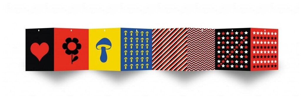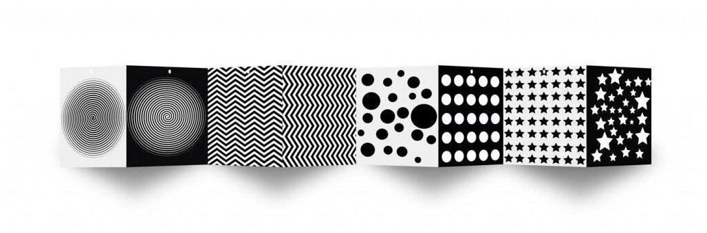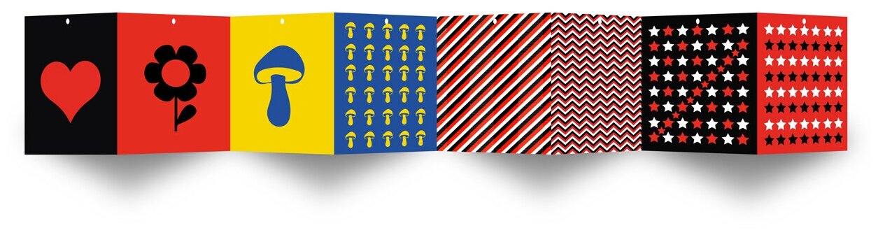 Сыну очень нравится разглядывать черно-белые картинки с абстрактными изображениями, но в сборнике другого издательства, который мы изначально приобрели их было всего несколько, поэтому решено было купить отдельную книгу Интеллект с контрастными изображения издательства "Вакоша". Она включает в себя 16 изображений, 8 черно-белых (спирали, линии, круги и звёздочки) и 8 цветных (звездочки, линии, грибы, цветочек и сердце), отпечатанных на обороте, складывается гармошкой. В верхней части каждой странички расположено отверстие, за него, видимо, можно повесить книжку на стену.