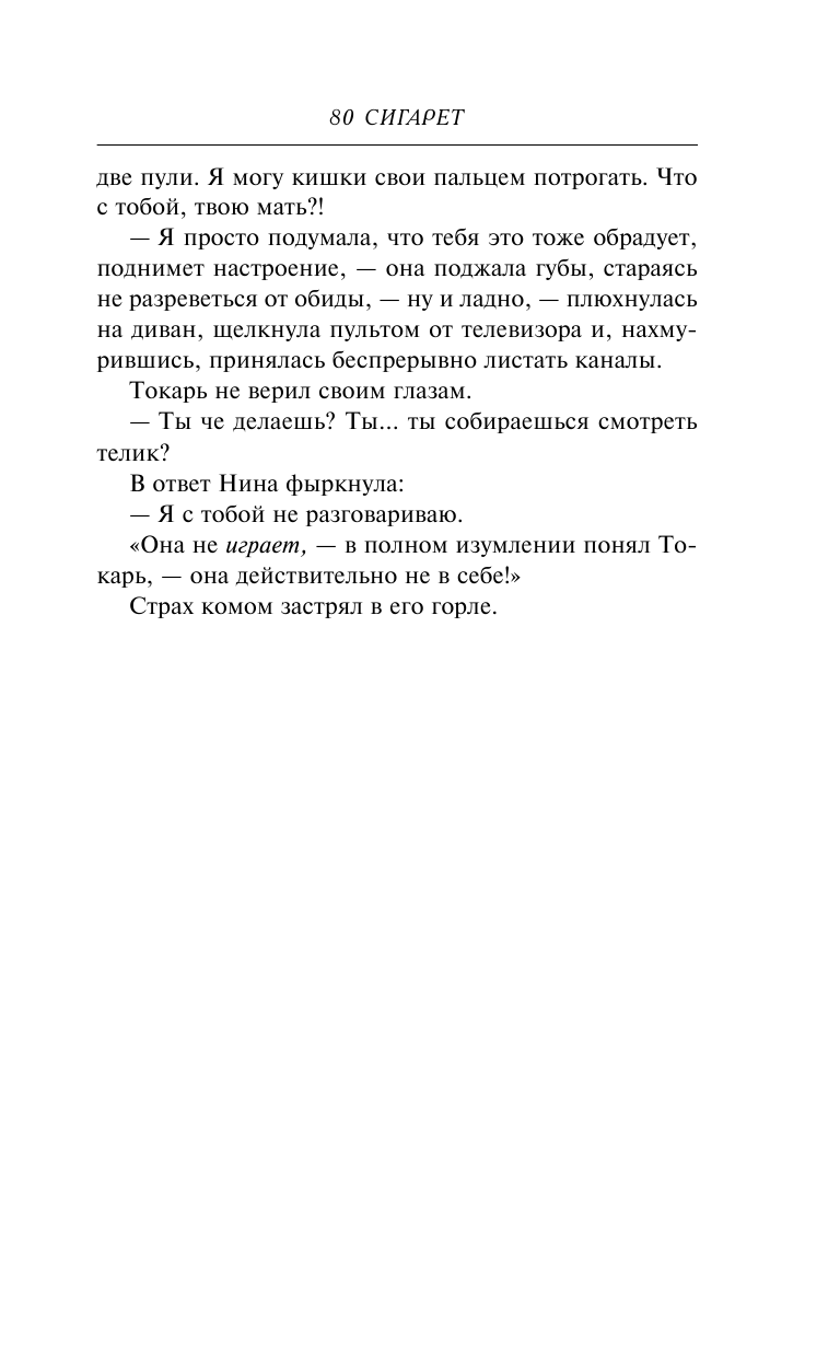 Надо отдать должное автору, книга производит неизгладимое впечатление. Многие сцены до сих пор стоят перед глазами, вызывая повторный приступ тошноты. Я не нежный цветочек, читала много неприятных книг, но «80 сигарет» - это нечто совершенно ошеломляющее. Возможно, из-за того, что описываются тюрьмы нашей страны, возможно, из-за того, что такие Токари и ему подобные действительно спокойно ходят по улицам, и все краем уха да слышали о том, что так подробно описывает автор.