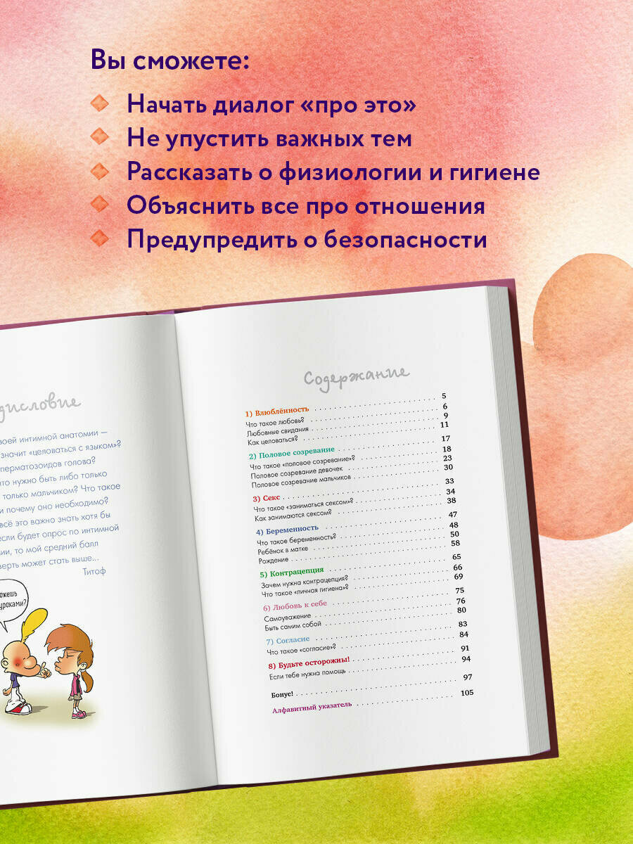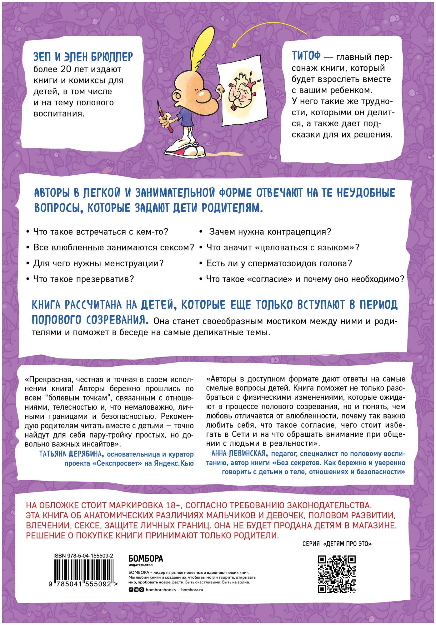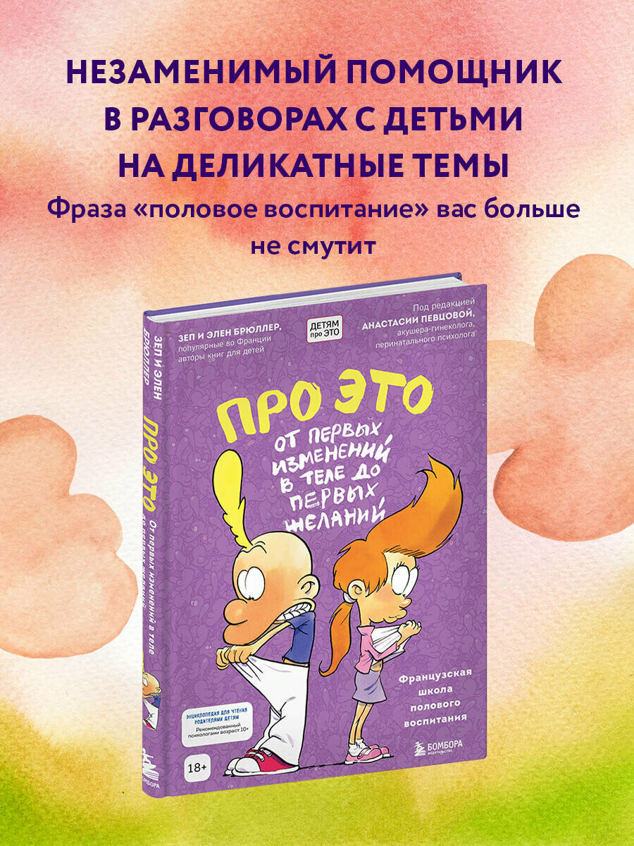 Как честно и доступно рассказать детям про переходный возраст? По мнению психологов, с подростками нужно говорить на темы, которые их очень волнуют в этот период. Что такое встречаться с кем-то? Обязательно ли заниматься сексом, если влюблен? Для чего нужны менструации? Что такое презерватив? Как действует контрацепция? Что значит "целоваться с языком"? Есть ли у сперматозоидов голова? Что такое "согласие" и почему оно необходимо? Как избежать нежелательной беременности? На эти и многие другие вопросы ответит книга "Про ЭТО: от первых изменений в теле до первых желаний". Издание рассчитано на детей, которые еще только вступают в период полового созревания. Оно станет своеобразным мостиком между родителями и детьми, и поможет в беседе на самые деликатные. Его авторы, Зеп и Элен Брюллер, уже более 20 лет издают книги для подростков и детей, а именно эта книга покорила сердца более 1.5 миллиона юных читателей во Франции.