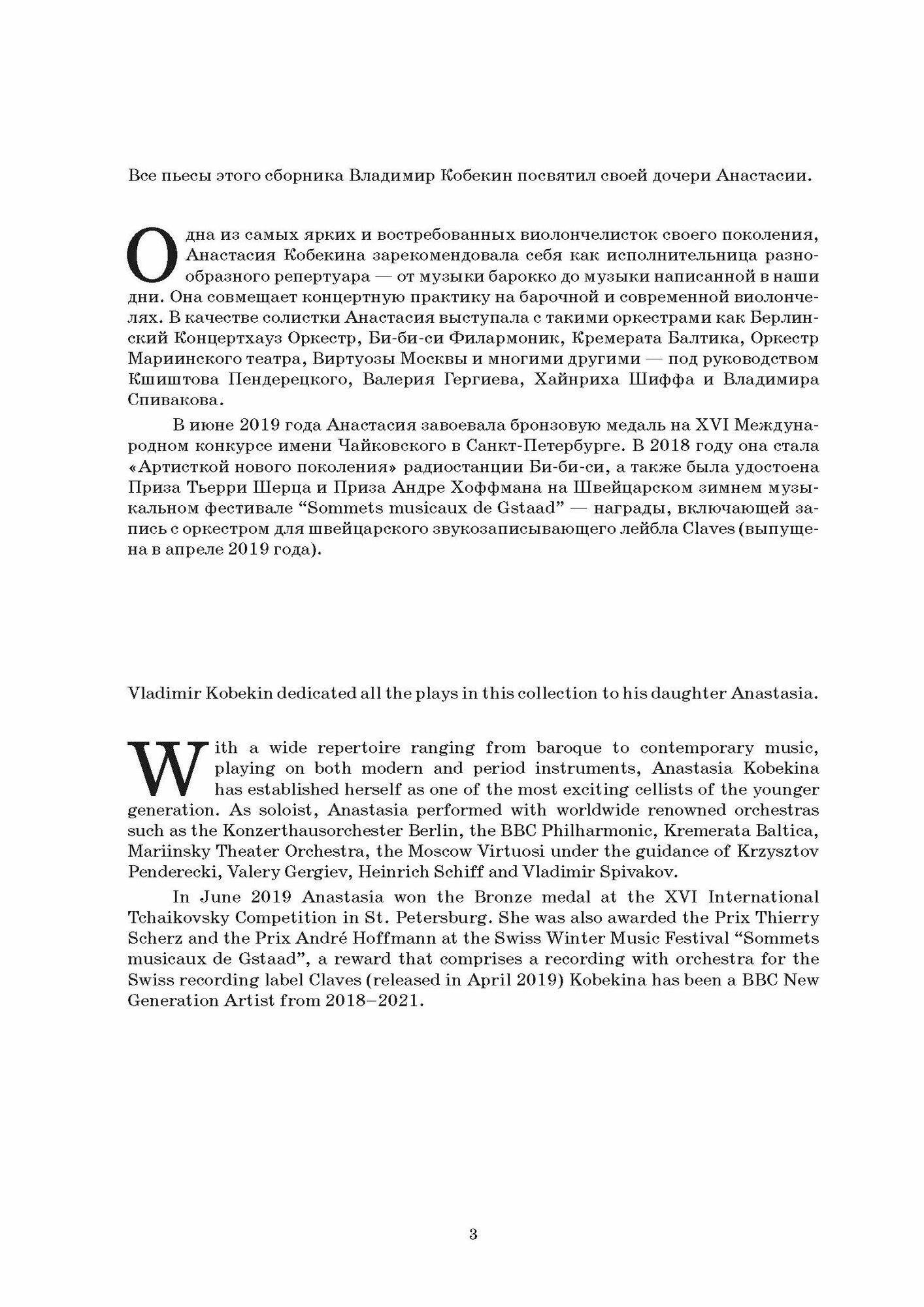 Все пьесы этого сборника Владимир Кобекин посвятил своей дочери Анастасии, виолончелистке, исполнительнице разнообразного репертуара - от музыки барокко до написанной в наши дни.