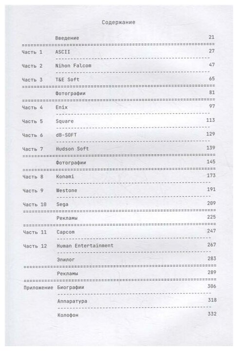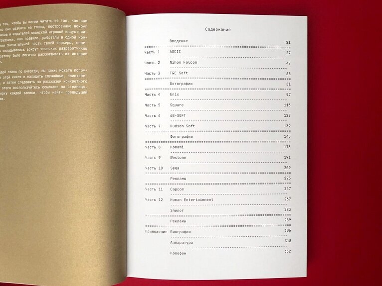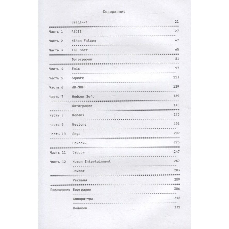 Дизайн, как я уже говорил выше, просто выше всяких похвал. Разная бумага в блоке. Фотографии разработчиков и студий тех времен стилизованы под растровые изображения, чтобы, видимо, дать больше духа времени (привет, японские 80-е!). Есть красивые рекламы первых японских игр, и рисунки первых японских компьютеров и консолей, которые упоминаются в книге (вплоть до первой PlayStation). Мой внутренний гик несколько раз умирал от красоты!