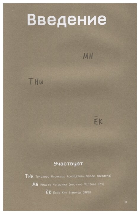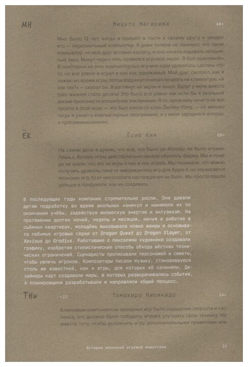 большинство участников книги малоизвестны русскому геймеру. В книге практически нет именитых продюсеров, типа Сигэру Миямото или того же Кодзимы или Ю Судзуки. Плюс в книге много говорят об играх, которые создавались для японских компьютеров (следовательно, они малоизвестны у нас). Но эта книга, насколько у меня сложилось мнение, не про создание великих игр (хотя в книге есть отдельные главки, посвященные Metal Gear, Dragon Quest, Rockman и другим) а про процесс зарождения того, что потом стало большой индустрией. Причем рассказанный через непосредственных участников, некоторые из которых даже позволяют себе критику (и это от политкорректных японцев!) Одним словом, здесь скорее про людей и атмосферу времени, чем про пиксели и игры.