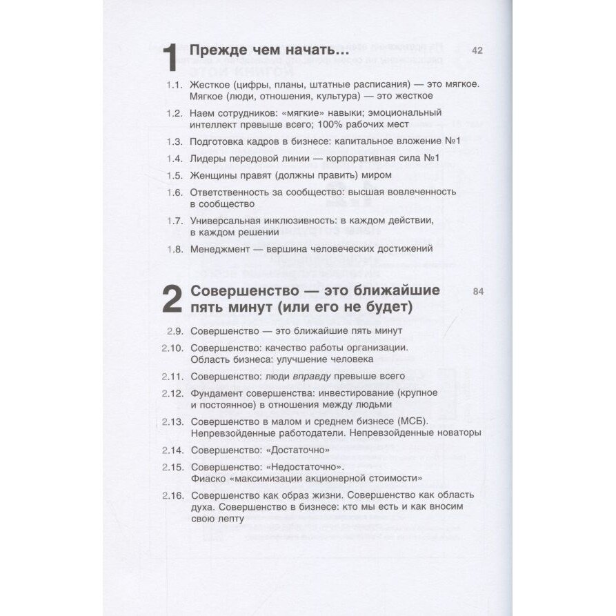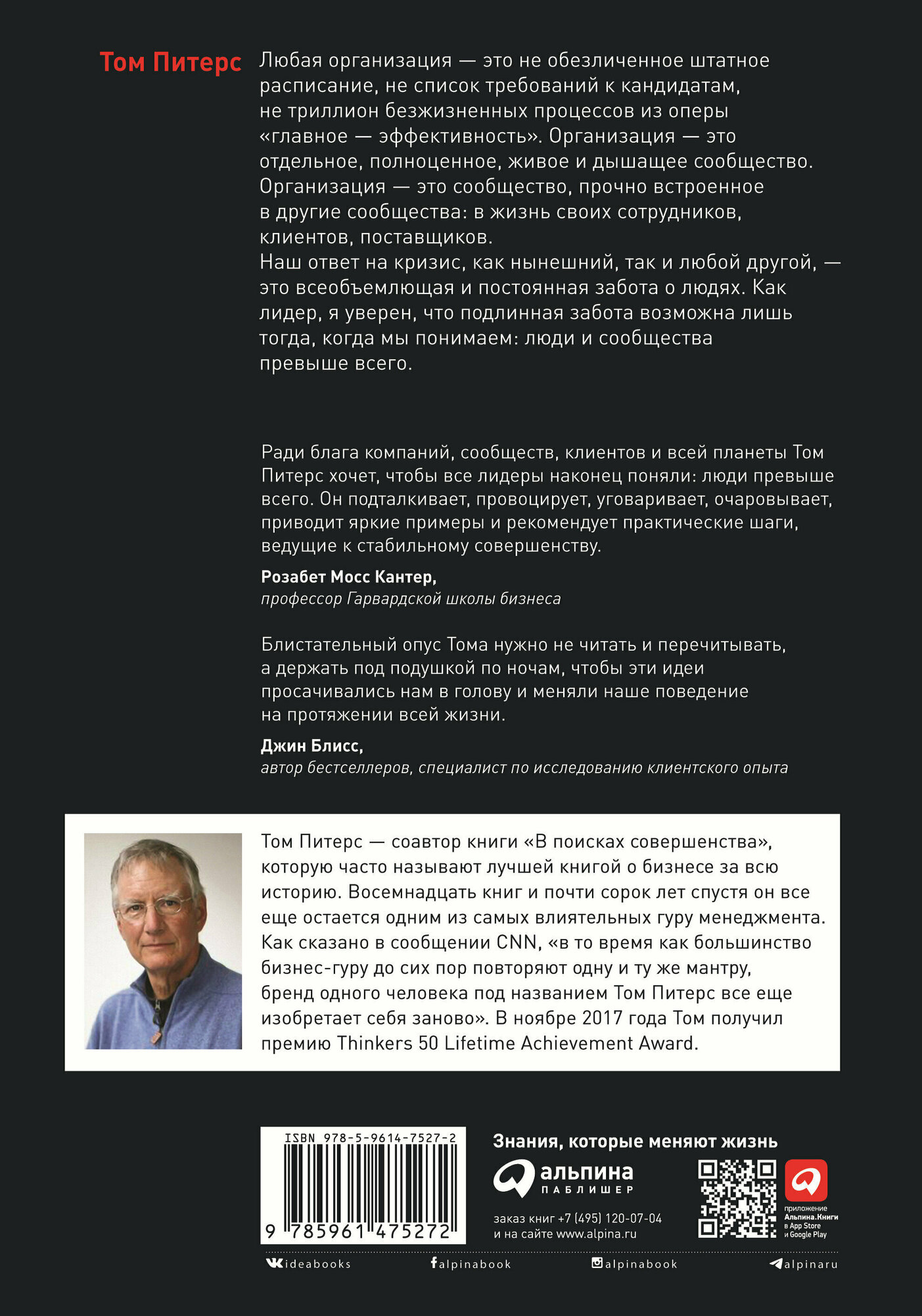 Наш непредсказуемый и постоянно меняющийся мир сотрясает пандемия COVID-19, терзают экономические кризисы и социальные конфликты. Вместе с этим голоса, требующие от бизнеса социальной ответственности и сопричастности жизни общества, звучат всё громче. Один из самых влиятельных гуру менеджмента — Том Питерс считает, что в этих условиях подлинные лидеры должны взращивать и сохранять в организациях культуру доверия, личностного роста, инноваций и подлинного равенства. Эта книга содержит 75 принципов эффективного и гуманного предпринимательства. Автор рассказывает, как повысить вовлеченность людей в работу и способствовать их развитию, идёт ли речь о персонале маленькой кофейни или огромной корпорации. Автор также предлагает практические рекомендации и задания для самопроверки, которые полезно (и нетрудно) выполнить, чтобы понять, в какой точке пути к совершенству находитесь вы сейчас и как действовать дальше.