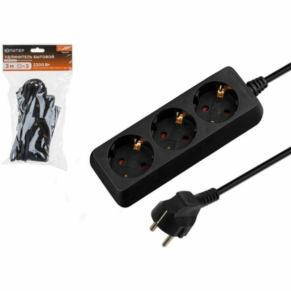 Удлинитель 3 м 3 розетки 2,2 кВт с заземлением юпитер черный () предназначен для присоединения электро- и радиоустройств к электрической сети переменного тока напряжением 220В. Используется в быту, офисе или частном доме.