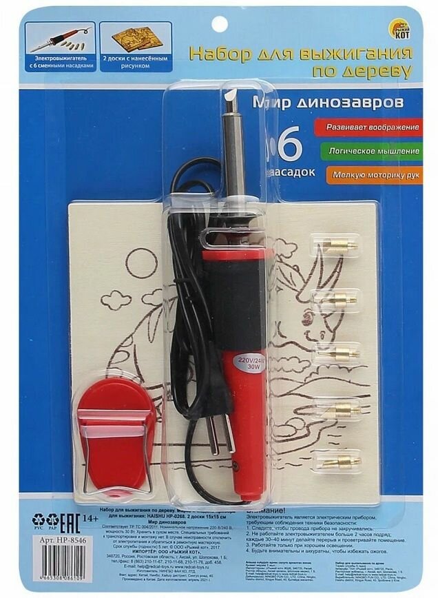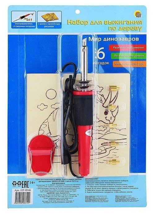 В комплекте: 2 доски с нанесенным рисунком (15х15 см), электровыжигатель, 6 насадок.