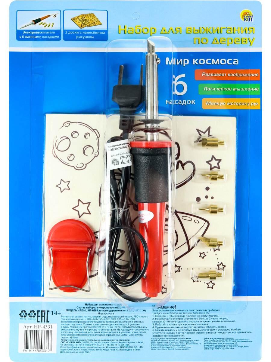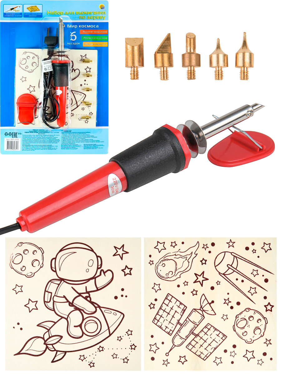 В комплекте: 2 доски с нанесенным рисунком (15х15 см), электровыжигатель, 6 насадок.