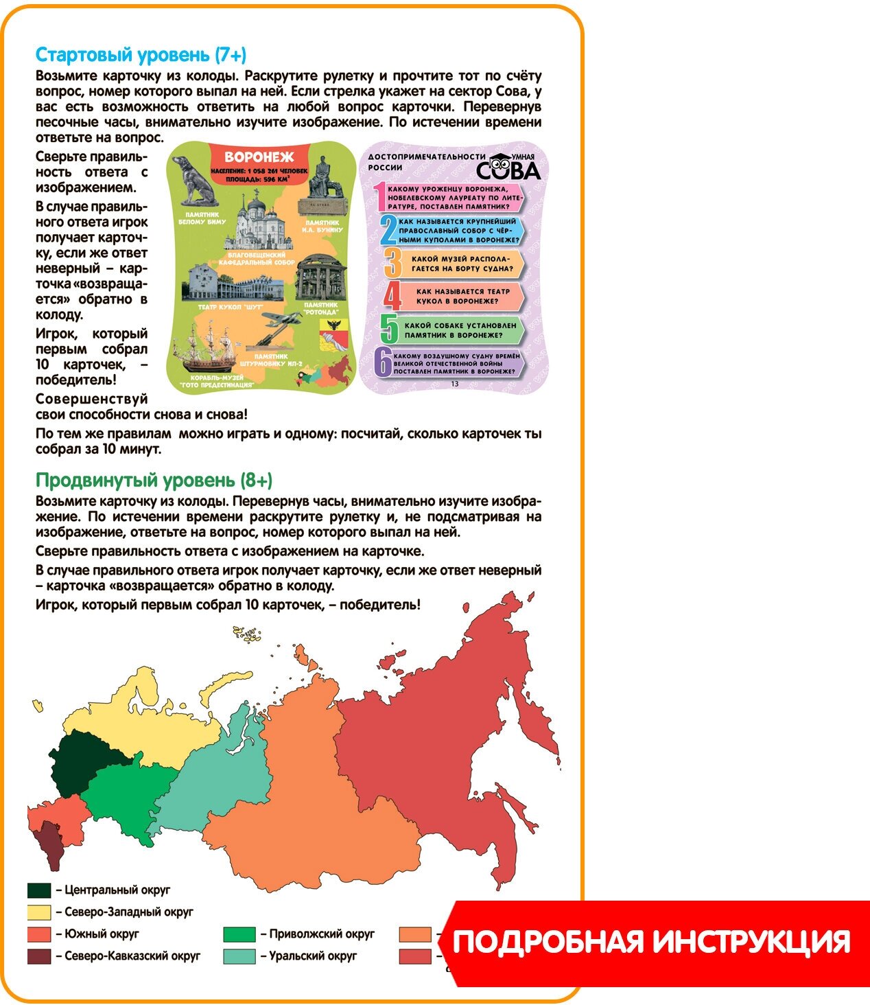 Узнавайте достопримечательности России и интересные факты о них в игровой форме с игрой-викториной "ДОСТОПРИМЕЧАТЕЛЬНОСТИ РОССИИ" Умная сова Bondibon. Умная Сова – это серия, которая расширяет кругозор, прививает интерес к познанию и развивает логику, память, скорость мышления, усидчивость, внимательность и наблюдательность. Новая информация усваивается ребенком уже пока он просто читает карточку. Это авторская разработка, предполагающая новую форму подачи материала и его усвоения. Берете карточку, раскручиваете рулетку, и отвечаете на вопрос, который выпал. Ответы изображены на обратной стороне. При правильном ответе игрок получает карточку. 10 карточек -и Вы победили.