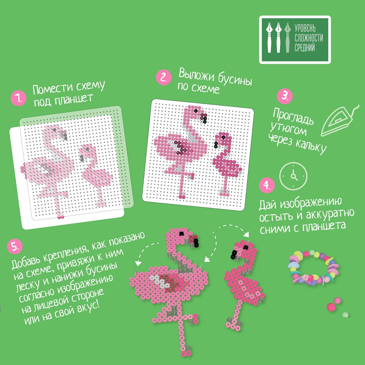 В набор входят термобусины, планшет, калька, схема сборки, пинцет, леска и крепление для создания украшений. Рекомендуется гладить на низких температурах и только под присмотром взрослых. Рекомендуемый возраст для игры 5+.