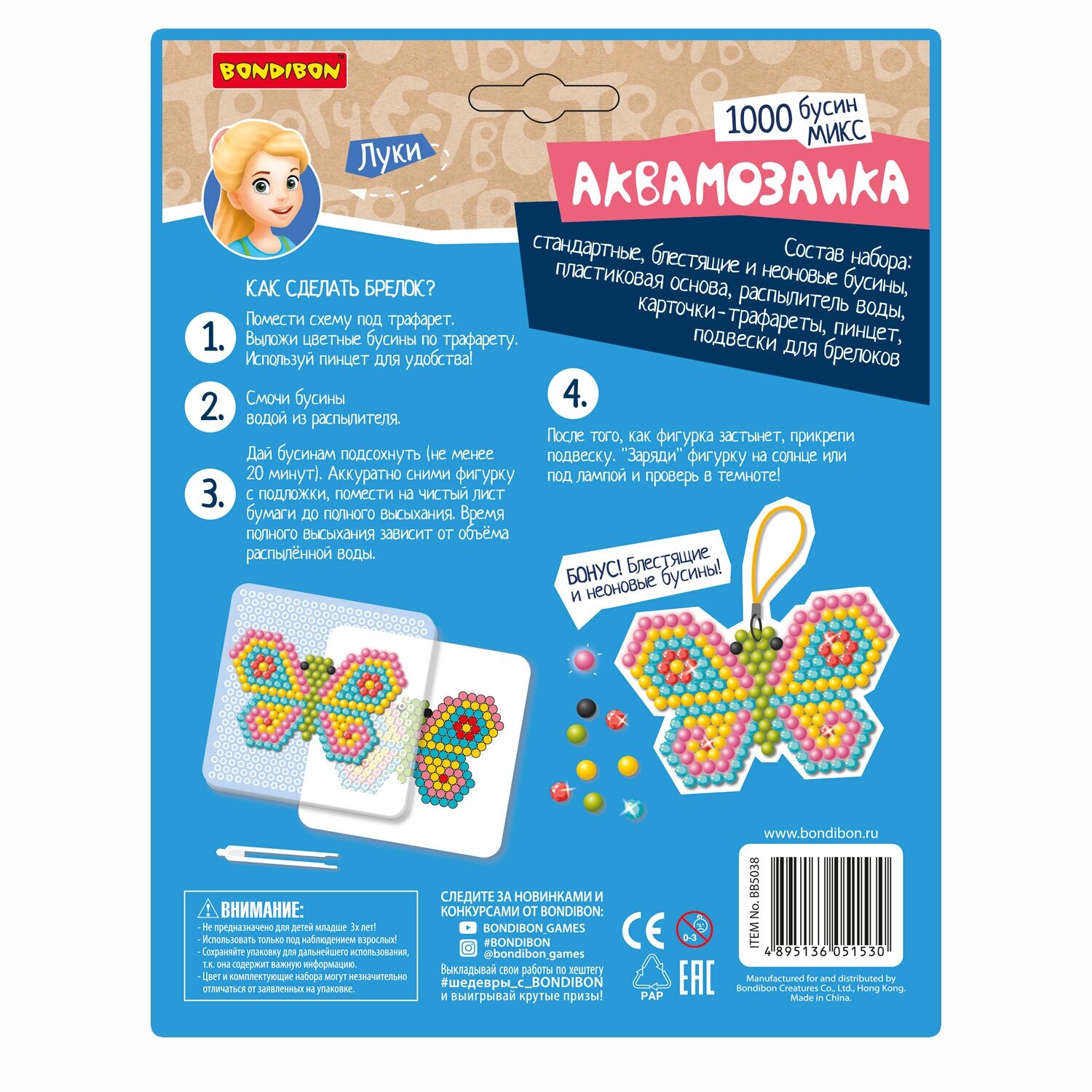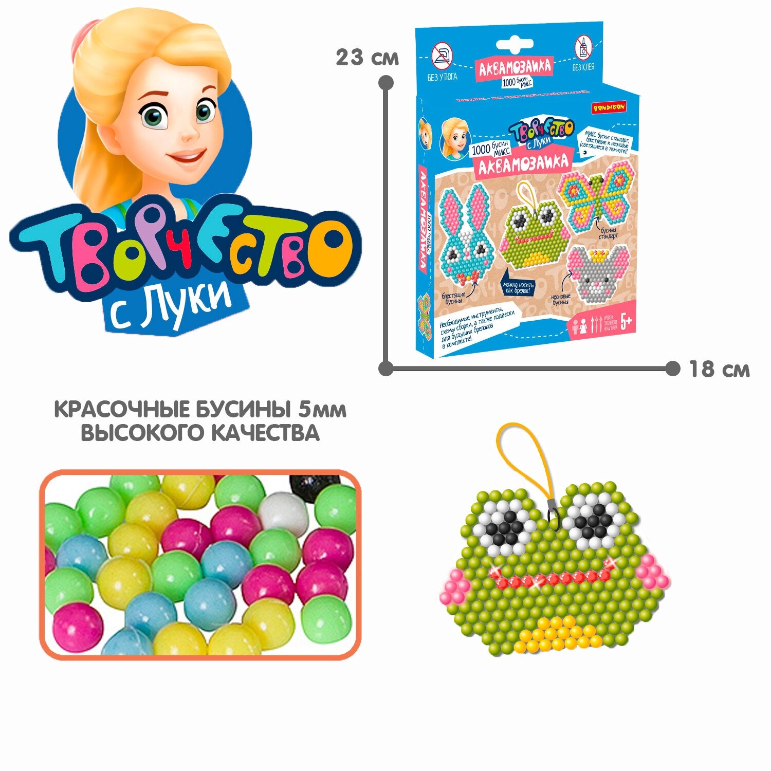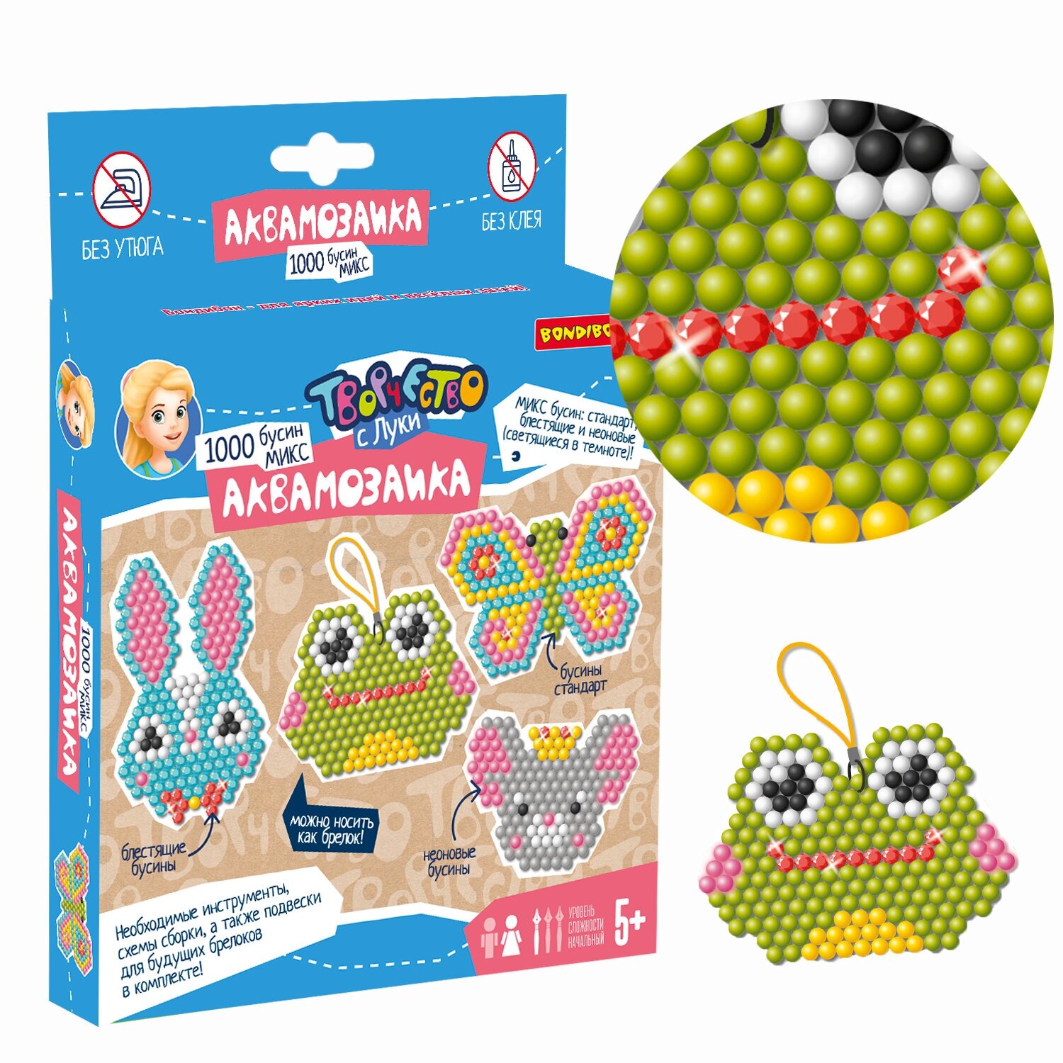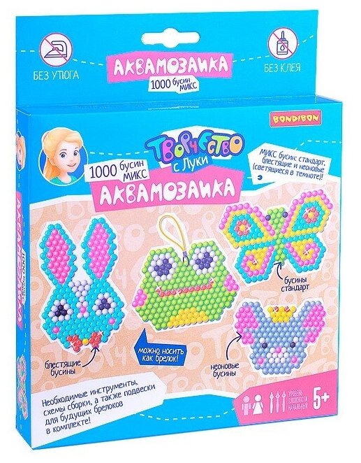 В набор входят стандартные, блестящие и неоновые бусины, пластиковая основа, распылитель воды, карточки трафареты и подвески для брелоков. Игра только под присмотром взрослых. Рекомендуемый возраст для игры 5+.