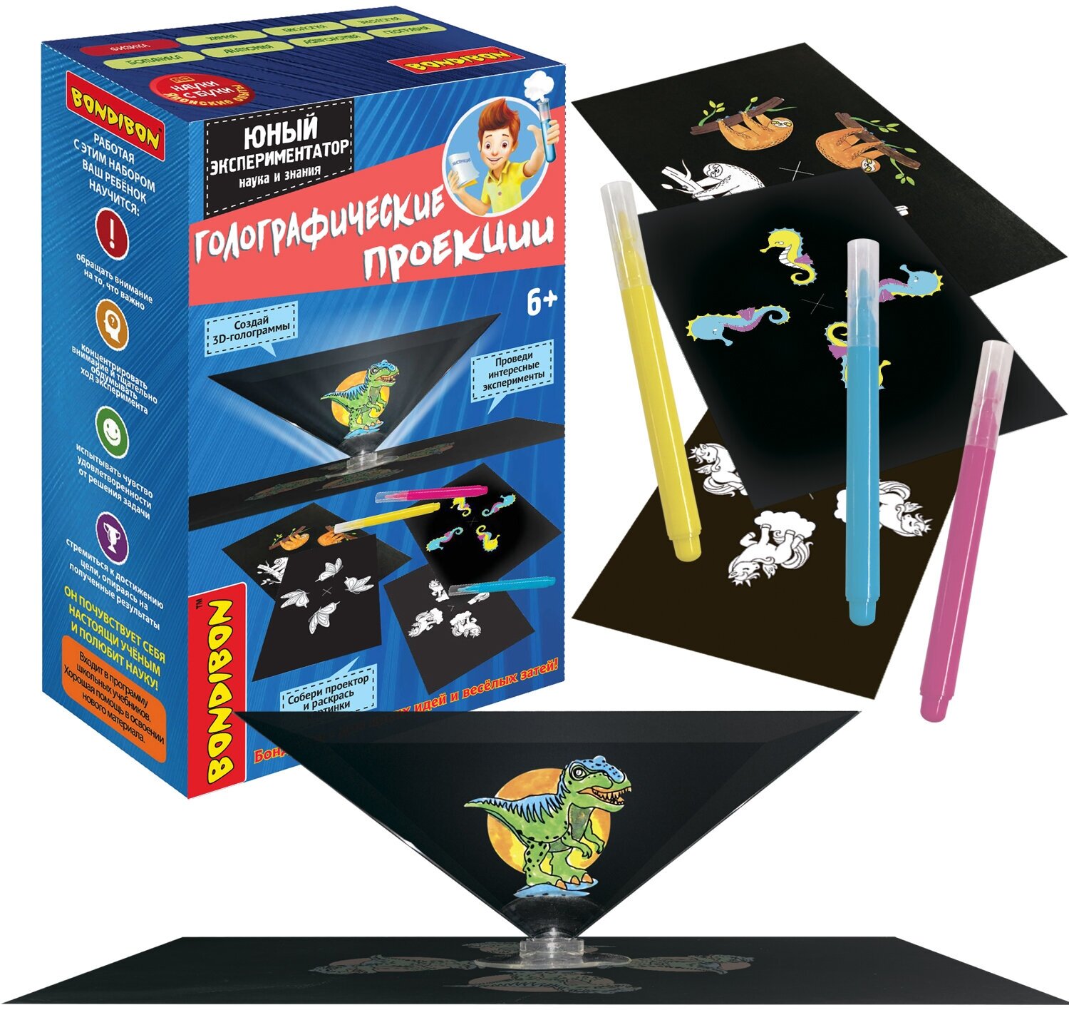 С помощью набора «ЮНЫЙ ЭКСПЕРИМЕНТАТОР. ГОЛОГРАФИЧЕСКИЕ ПРОЕКЦИИ» из серии Японские опыты «Науки с Буки» от Bondibon вы сможете не только познакомиться с понятием голограммы, но и поможете ребенку развить логику, воображение, мелкую моторику и кругозор.