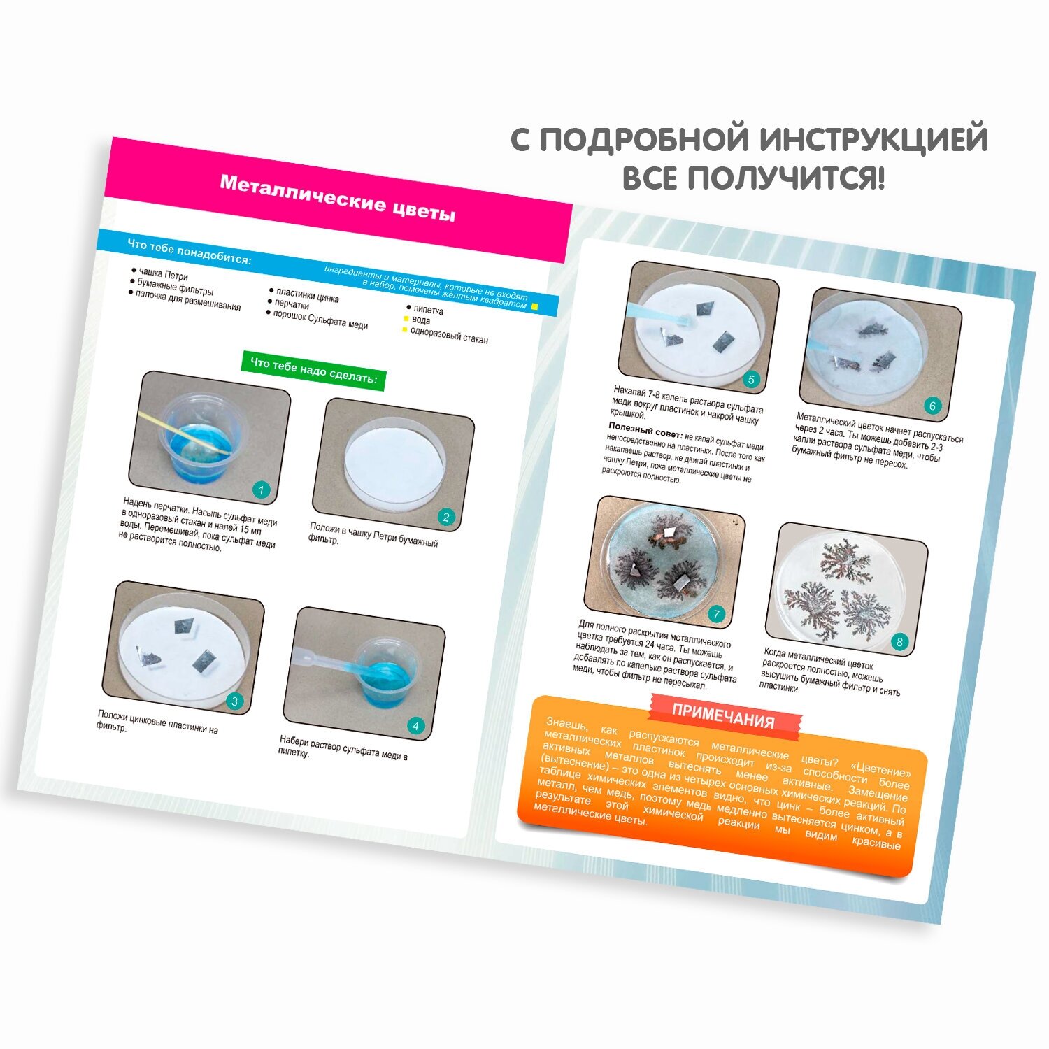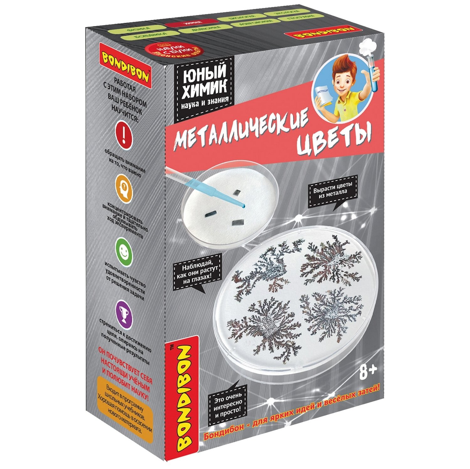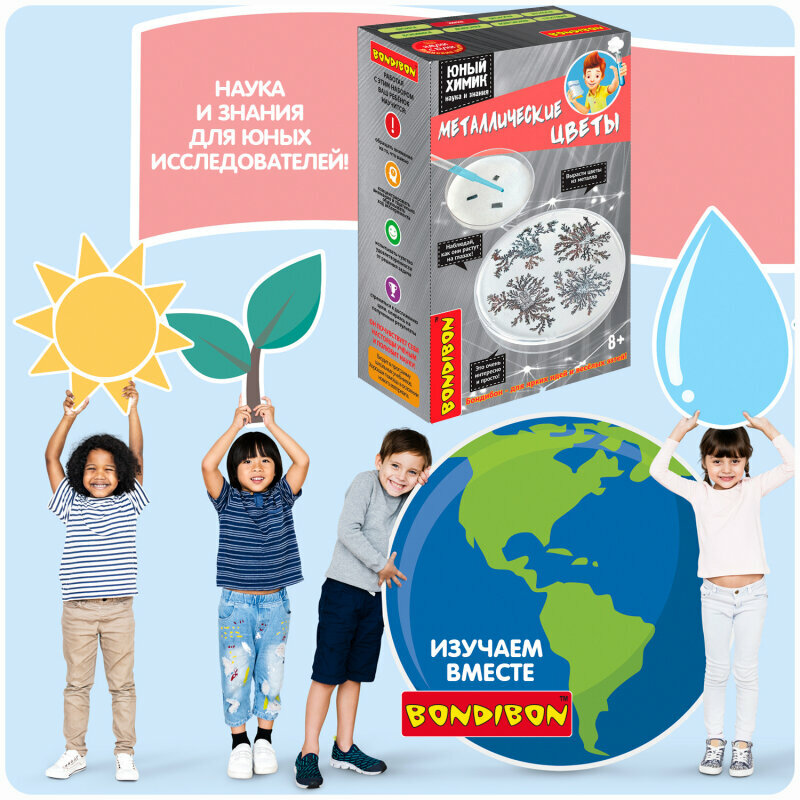 С помощью набора «ЮНЫЙ ХИМИК. МЕТАЛЛИЧЕСКИЕ ЦВЕТЫ» из серии Японские опыты «Науки с Буки» от Bondibon вы сможете не только познакомить ребенка с химией, но и поможете развить логику, воображение, мелкую моторику и кругозор.