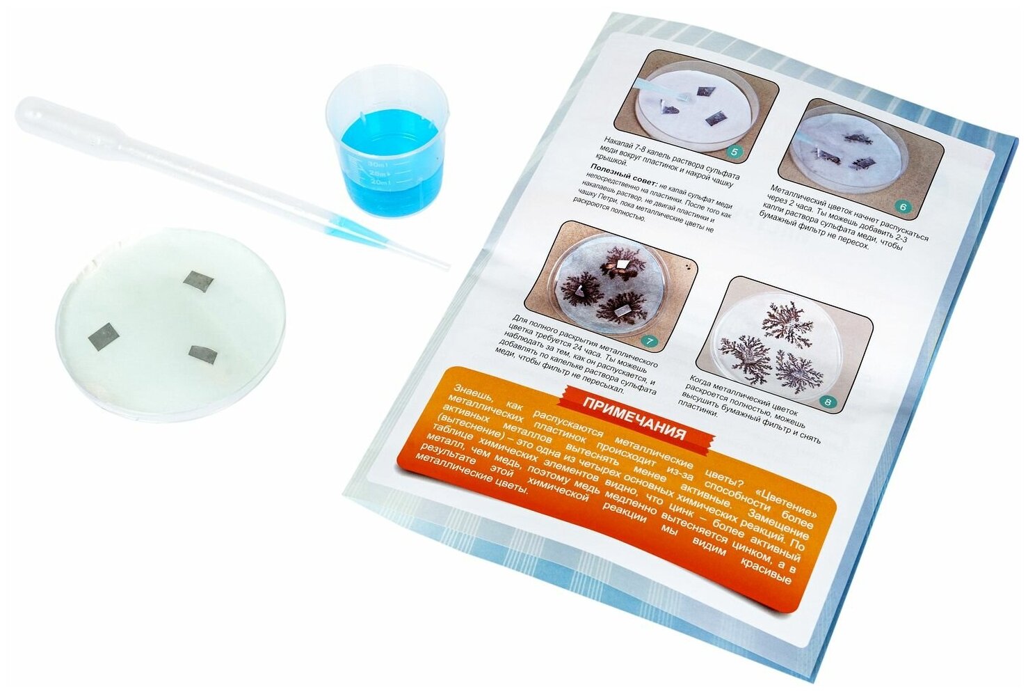В комплекте: чашка Петри, бумажные фильтры, палочка для размешивания, пластинки цинка, перчатки, порошок сульфата меди и пипетка.