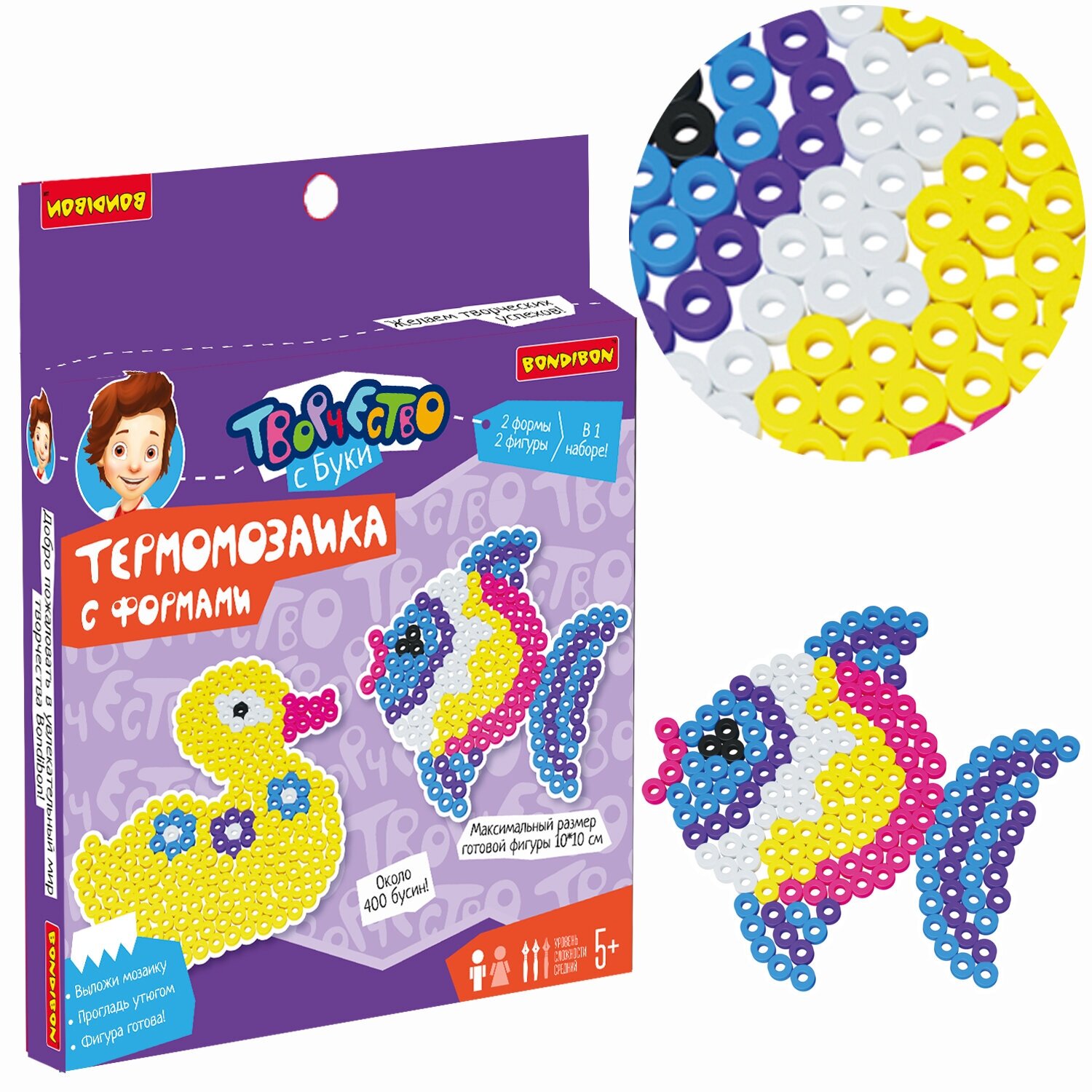 В набор входят более 400 термобусин, 2 фигурные формы, цветные схемы, калька и пинцет. Необходимо гладить на низких температурах и только под присмотром взрослых. Рекомендуемый возраст для игры 5+. Максимальный размер фигуры 10х10 см.