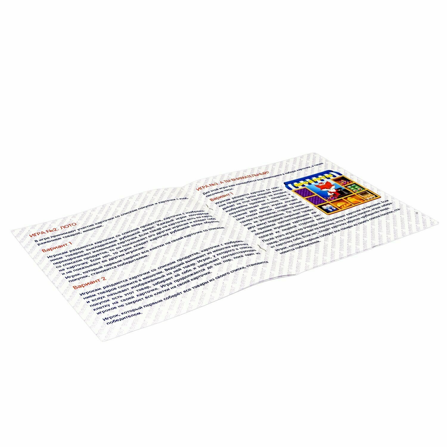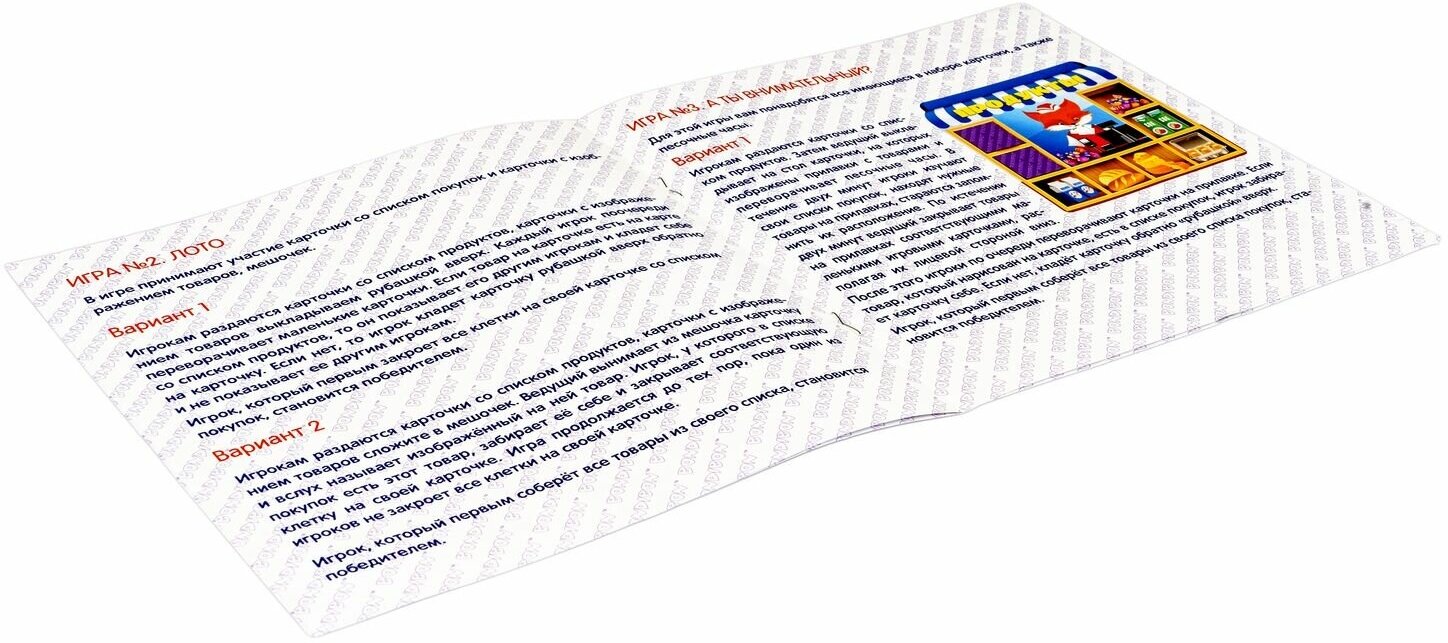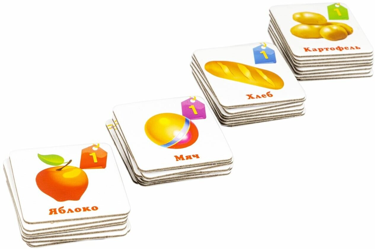 | Состав набора | 4 карточки-«прилавка», 4 карточки со списком продуктов, 32 карточки с изображением товаров, песочные часы, 50 монет, 4 кошелечка и тканевый мешочек |