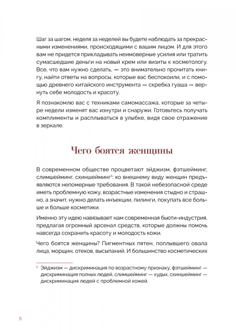 В книге собрано много полезной информации о гуаша: методах использования скрёбка, косметических маслах, которые нужны для массажа, техниках массажа. Есть QR-коды на маленькие видео без звука с демонстрацией техник массажа.