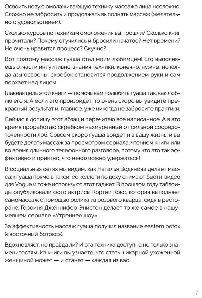 Автор основательно подошла к написанию книги. Всё чрезвычайно подробно описано и не только техника массажа гуаша, но и массажа роликом. Очень хороший раздел с чем делать массаж- это масла и гидролаты. Большие цветные фотографии, есть в углу каждой фотографии QR-код( пока не пробовала). Приятная обложка, белая бумага, чёткий шрифт. Книга небольшая, лёгкая, её вполне можно брать с собой , при необходимости. В книге есть реклама продукции автора, но для меня это не было неприятно. Хорошее и очень полезное издание. Покупка не разочаровала.