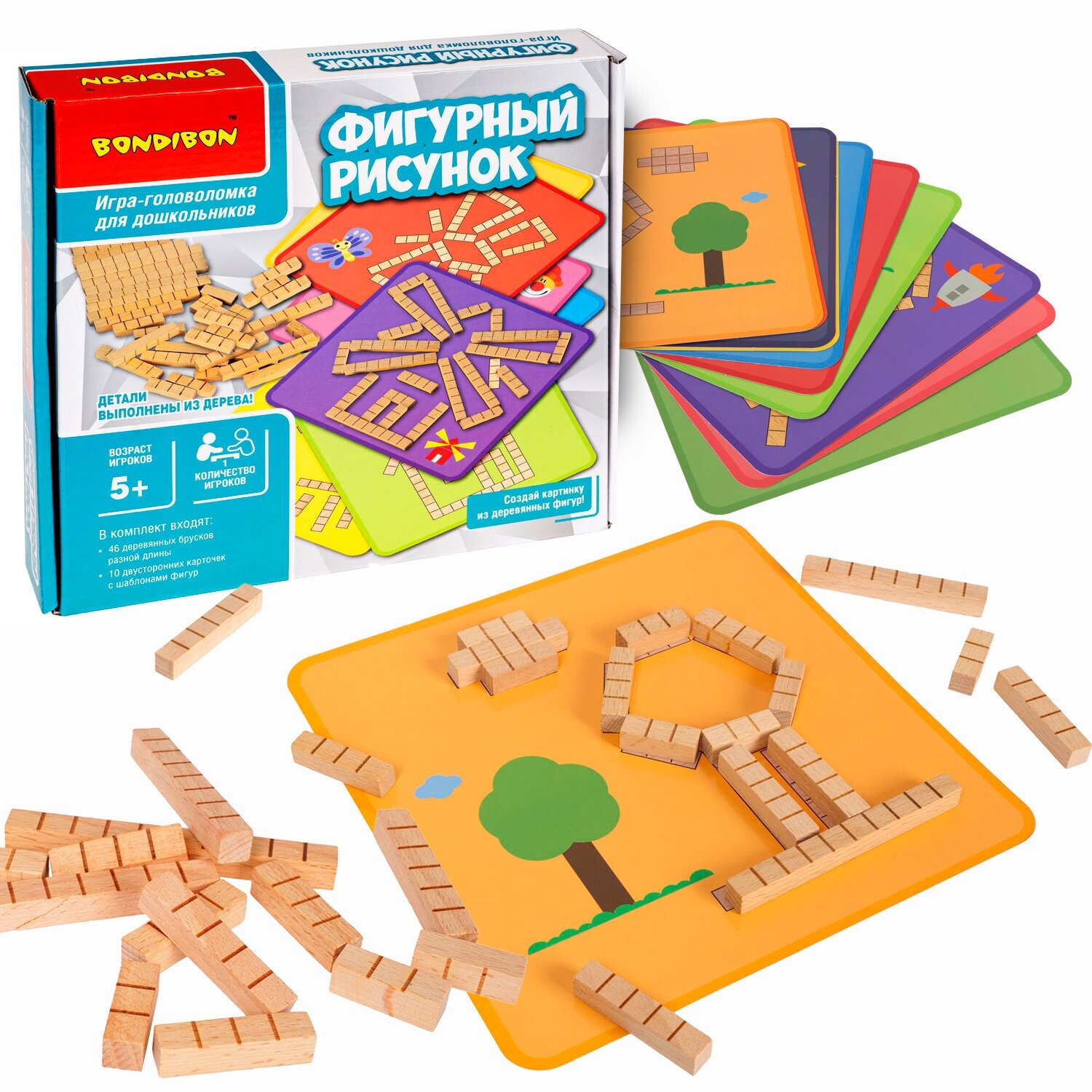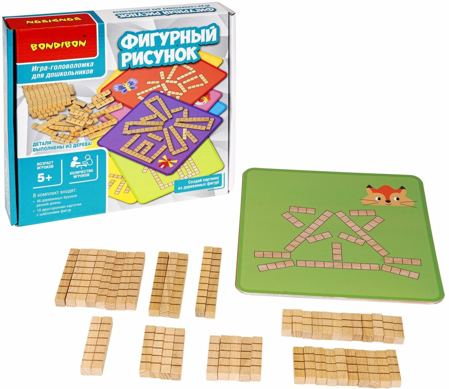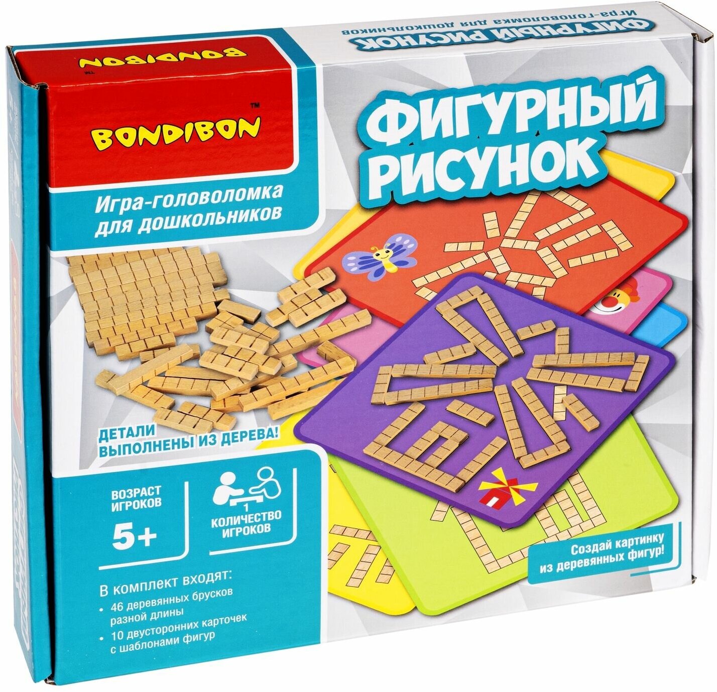 - Игра-головоломка «ФИГУРНЫЙ РИСУНОК» 20 логических заданий с деревянными блоками БондиЛогика Bondibon