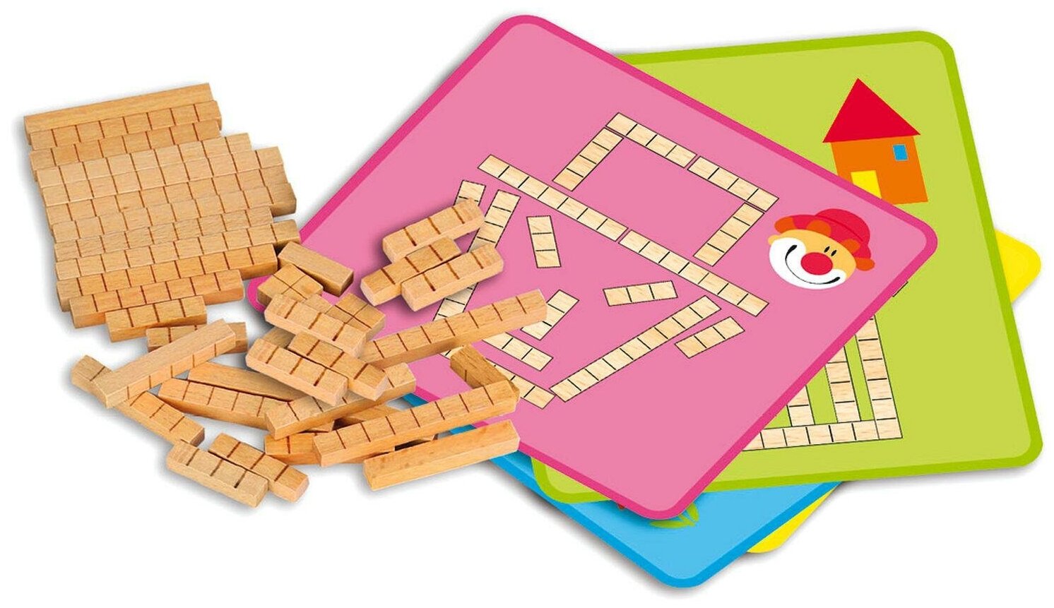 В комплекте: деревянные детали 48 штук, 10 двусторонних карточек с шаблонами фигур.
