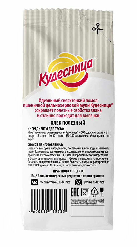 Описание товара:В чем разница между пшеничной мукой высшего сорта и цельнозерновой пшеничной мукой? Конечно, в пользе. Такую муку получают путем грубого помола, благодаря чему мука содержит оболочку зерен и сохраняет в себе полезные макро- и микроэлементы, которые положительно влияют на состояние кожи и волос. Именно с помощью пшеничной цельнозерновой муки Вы сможете сделать привычную выпечку полезнее, сохранив при этом отменный вкус готового продукта! Специально для Вашего удобства на оборотной стороне упаковки цельнозерновой муки «Кудесница» размещен вкусный рецепт Домашнего хлеба. С «Кудесницей» все просто, а главное полезно. Разнозлаковая мука «Кудесница» - это всё она!Состав товара:Мука пшеничная цельнозерновая.