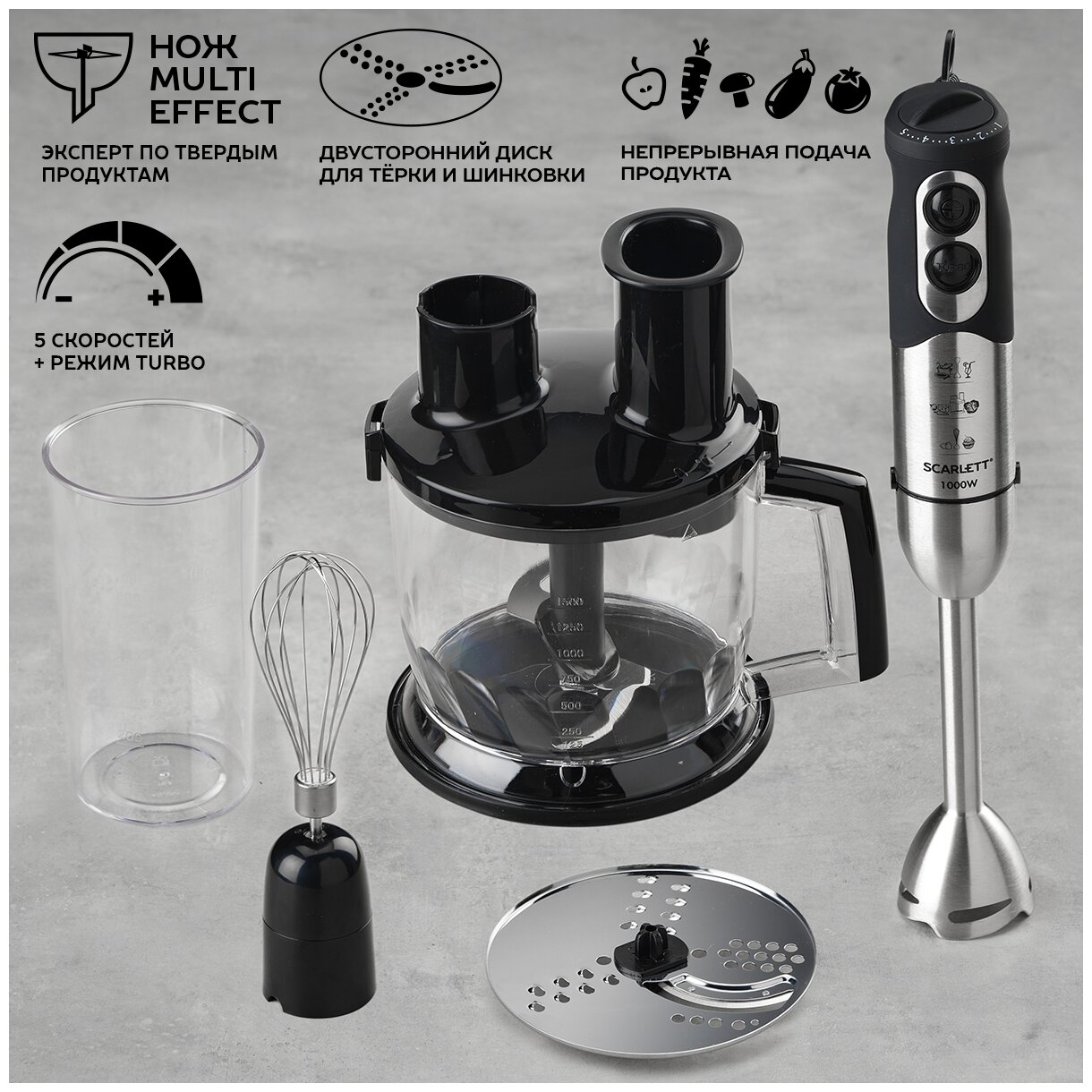 Идеальный кухонный помощник. С помощью Scarlett Вы можете без труда приготовить даже самое замысловатое блюдо, не тратя много времени на подготовку ингредиентов. С шинковкой капусты или моркови, измельчением орехов и сухофруктов, изготовлением невесомых десертов или домашнего майонеза этот превосходный инструмент справится за считанные секунды. Его применение поможет даже начинающим домохозяйкам достигать настоящих кулинарных высот и радовать любимого мужчину потрясающими блюдами.