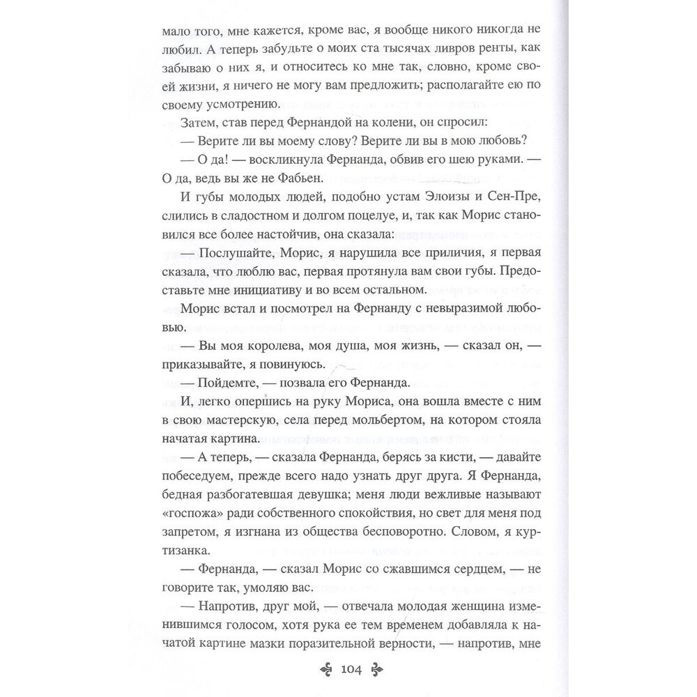 Но… дальше ничего. (Кстати, автор припас для читателя еще две неожиданности, но первую он обыгрывать не стал, а вторая, хотя и была пущена в ход, была «разбита» благородной куртизанкой). Фабьен и Леон доставили-то куртизанку в дом г-жи де Бартель, но на том всё и закончилось. Фернанда оказалась чересчур морализаторски правильной, как бы странно это не прозвучало, что сыграло роману не на пользу, превратив произведение в нудное и посредственное, однако не без толики смысла. Но в данном случае, это скорее минус, чем плюс, ибо роман не удался. Прочитан он был, но без особого удовольствия и последние сто пятьдесят страниц через строчку, но этого было достаточно, чтобы составить впечатление о книге.