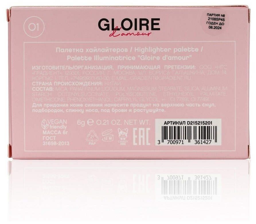 | Полное описание | Легендарный хайлайтер Gloire d’Amour в новом дизайне стал только лучше, сохранив все свои преимущества. Текстура с высоким содержанием светоотражающих частиц деликатно подсвечивает отдельные зоны лица и подчеркивает натуральное сияние и красоту кожи. Оттенки идеально сочетаются между собой, создавая баланс теплых и холодных полутонов для максимально естественного эффекта. |