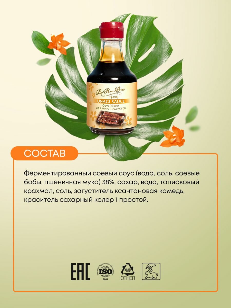Соус Унаги придает блюду изысканные сладко-солено-копченые нотки. Прекрасно подходит к блюдам из рыбы, а также к суши и роллам.