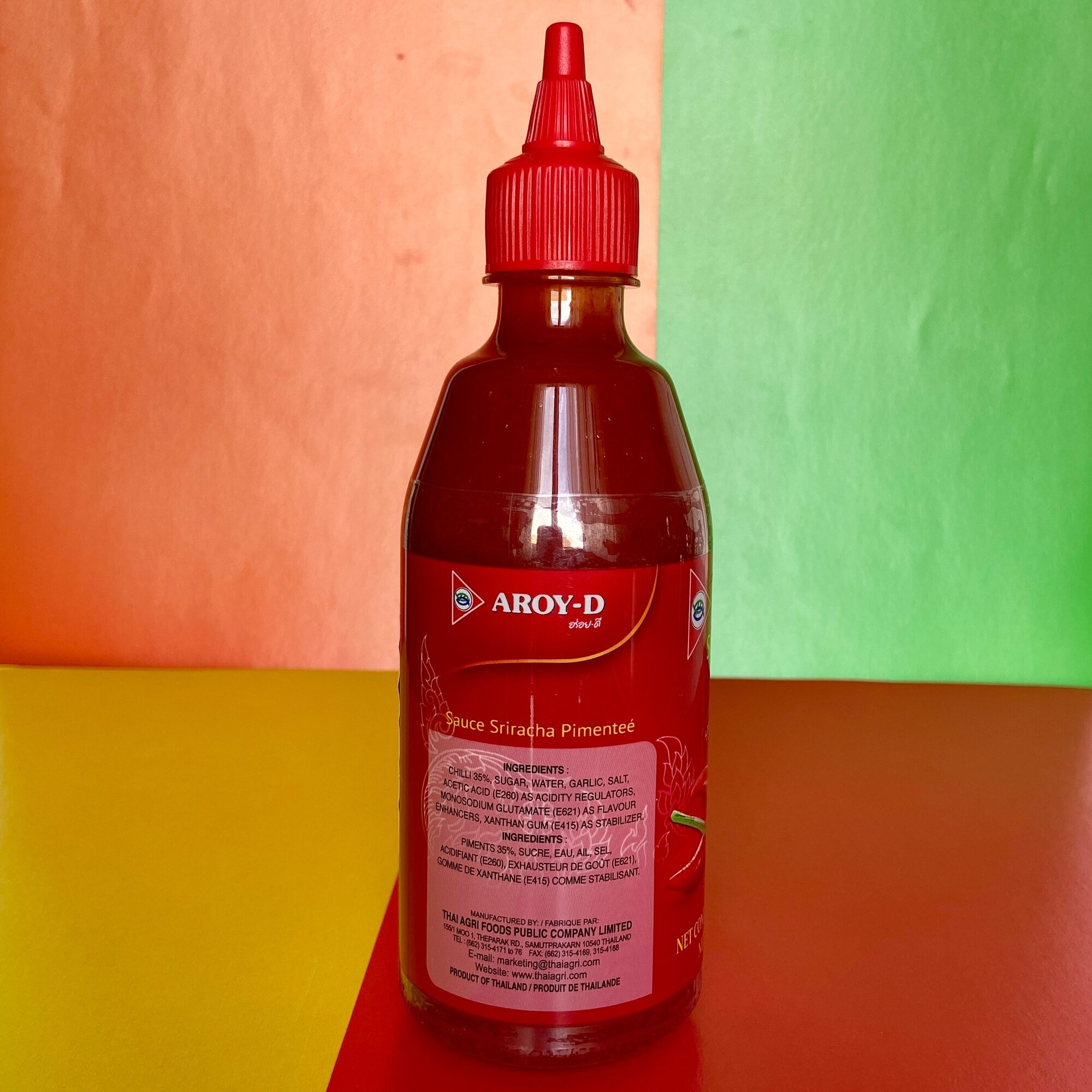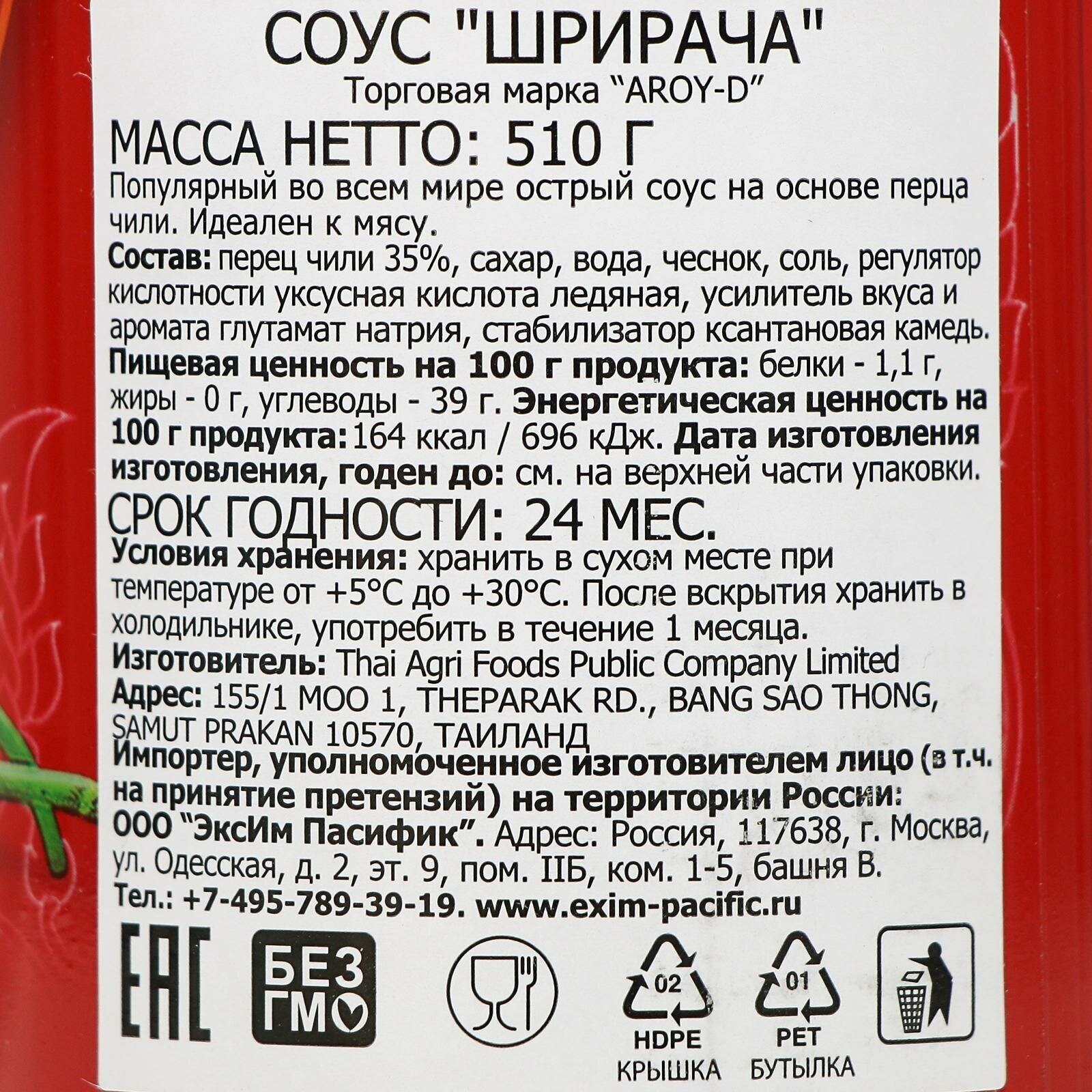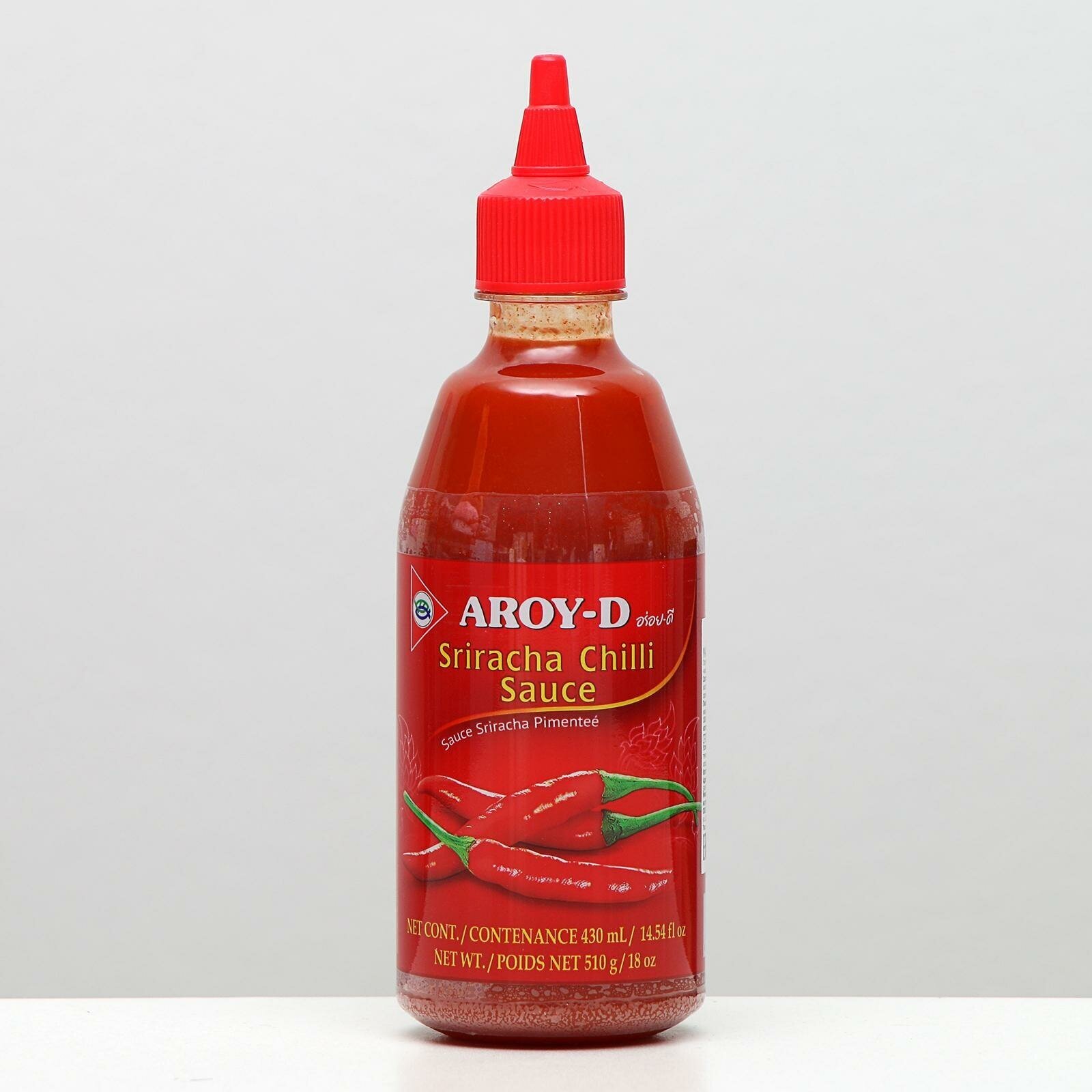 Соус Aroy-D Шрирача – это находка для всех любителей острого! Он идеально подходит для блюд из мяса, супов, а также для маринада шашлыка. Соус считается средне острым и содержит 35% перца чили. Его состав: сахар, вода, перец чили, чеснок, уксус, глутамат и стабилизатор ксантановая камедь. Упаковка - пластиковая бутылка с дозатором. Вес 510 грамм. Если вы любите острые блюда, то этот соус точно для вас! Он добавит остроты вашим блюдам и сделает их еще вкуснее. Заказывайте прямо сейчас!Популярный во всем мире острый соус на основе перца чили. Соус был первоначально сделан в прибрежном городе Сирача в провинции Чонбури восточного Таиланда, отсюда и его название. Это соус средней остроты, примерно 1.000-2.500 единиц на шкале остроты Сковилла, которая измеряет остроту перцев чили.Соус используется в блюдах из рыбы и мяса в качестве приправы либо маринада, для запекания и томления. Нередко с ним готовят пиццу, хот-доги, пасту, гамбургеры. Сам по себе соус средне- острый- содержание перца чили 35 %.