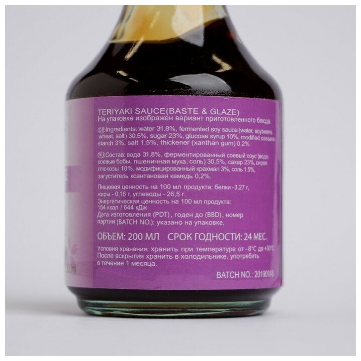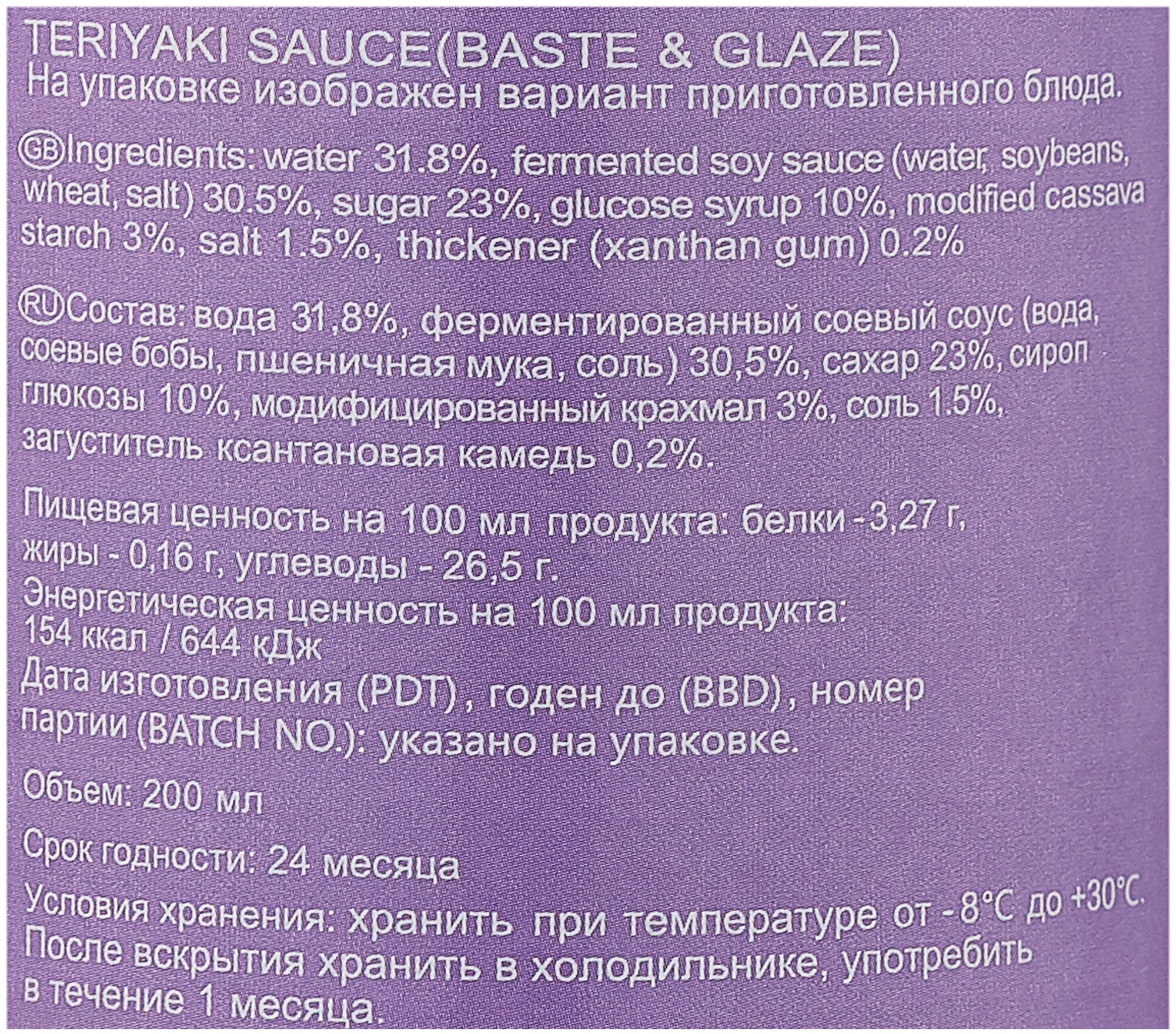 | Состав | вода 31,8%, ферментированный соевый соус (вода, соевые бобы, пшеничная мука, соль) 30,5%, сахар 23%, сироп глюкозы 10%, модифицированный крахмал 3%, соль 1,5%, загуститель ксантановая камедь 0,2% |
