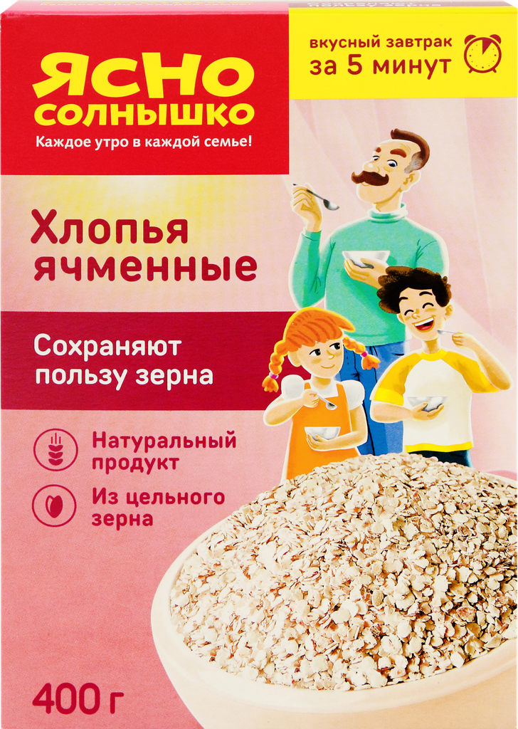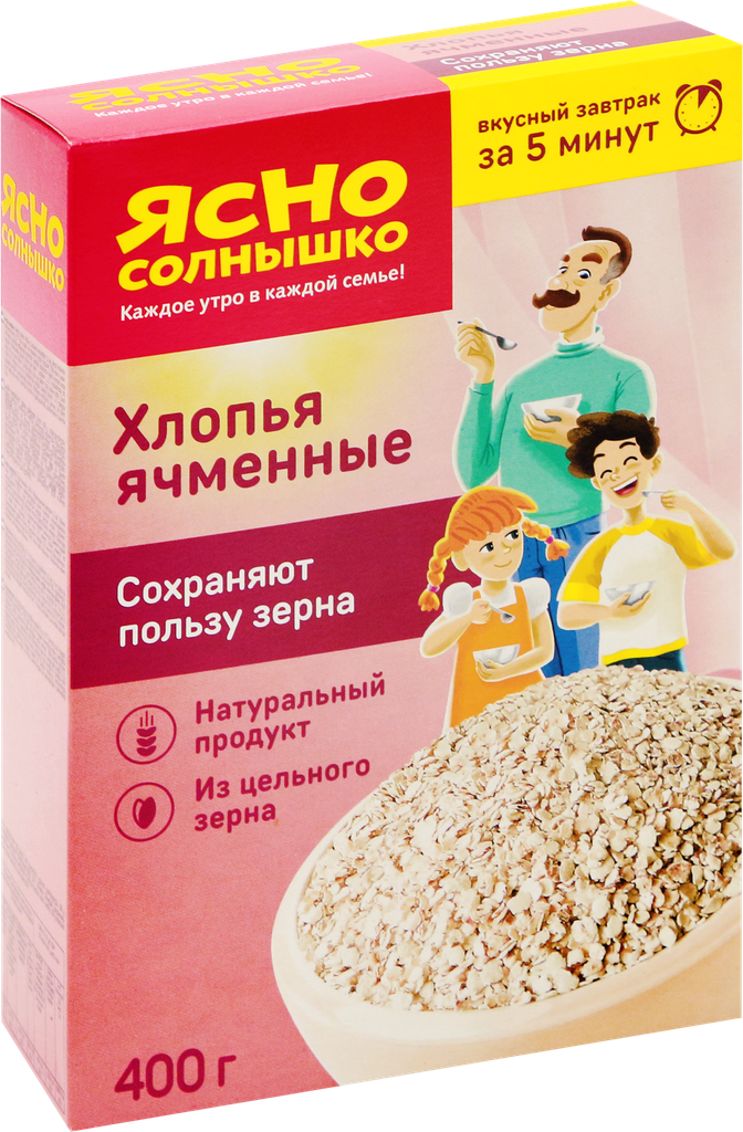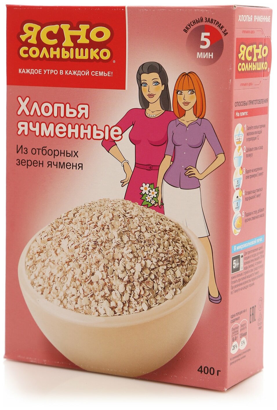 Состав товара:Хлопья ячменные, требующие варки.Способ приготовления:Залейте хлопья горячим молоком или водой в пропорции 1:2. Добавьте соль и сахар по вкусу. Варите на медленном огне примерно 5 минут. Оставьте кашу томиться под крышкой еще 5 минут.