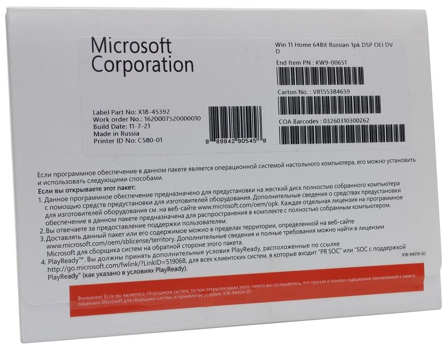 Право на использование OEM Microsoft Windows 11 Home 64Bit Russian 1pk DSP OEI DVD