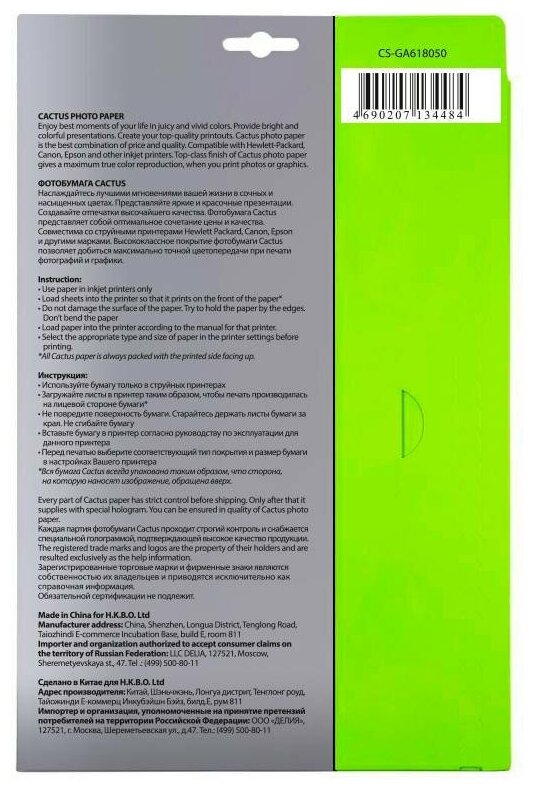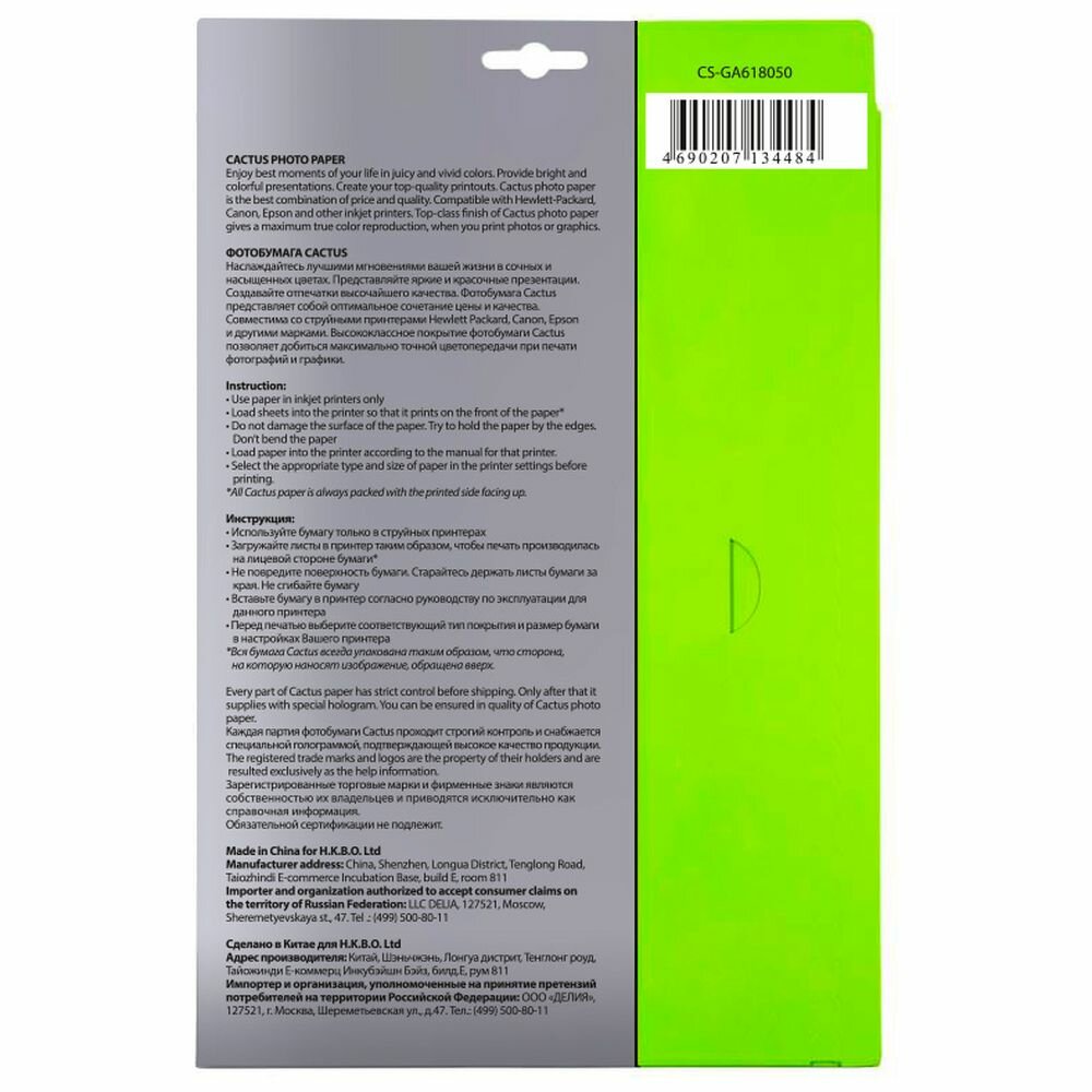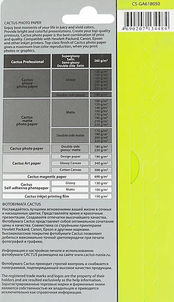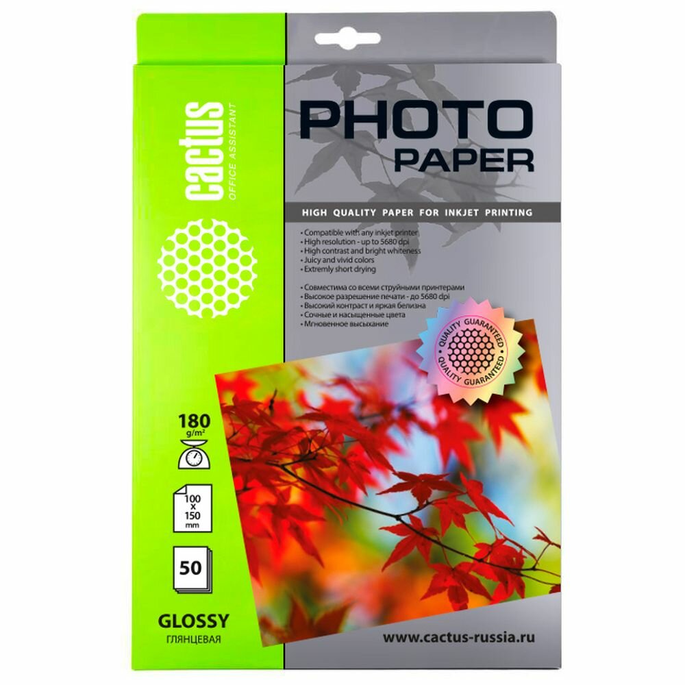 Cactus CS-GA618050 — глянцевая фотобумага формата 10x15 см для струйной печати.