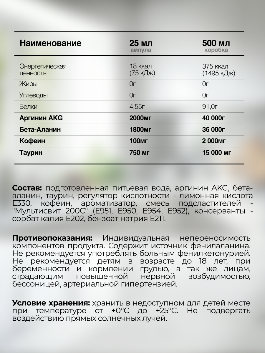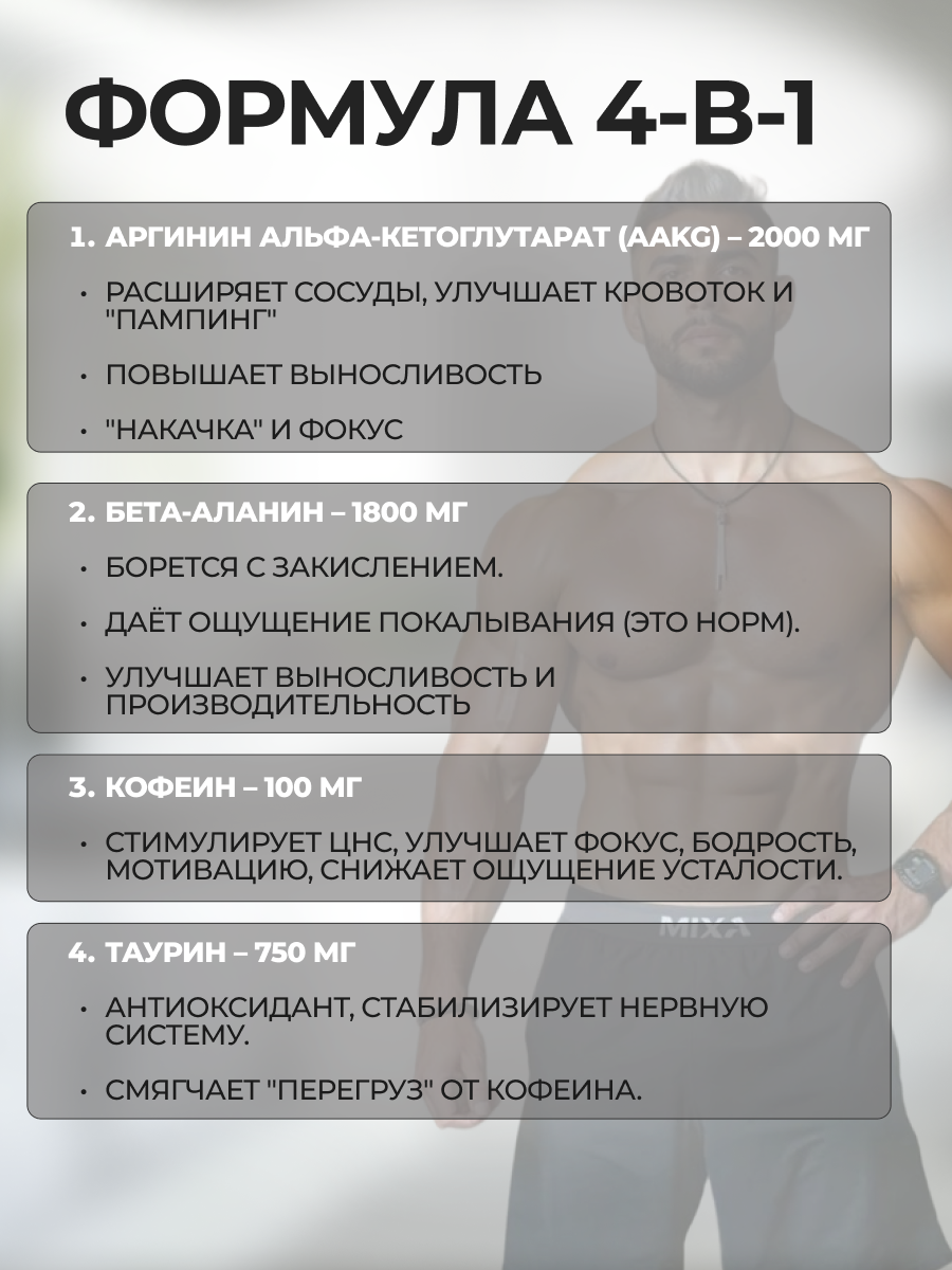 Мощный предтренировочный комплекс.Гарантия максимальной эффективности тренировок. Аргинин основной донатор NO (окись азота). Снабжая азотом систему ферментов, улучшает работу кровеносной системы. Снижает уровень холестерина в крови.
