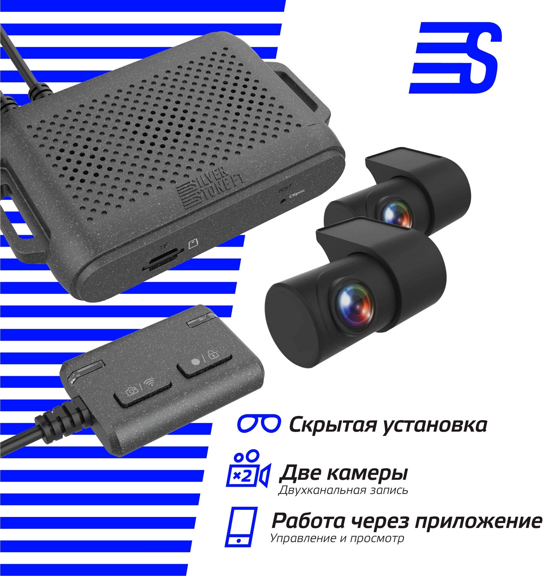 SilverStone F1 видеорегистратор, предназначенный для скрытой установки. Основной блок устройства монтируется в бардачке, а на лобовом и заднем стекле устанавливаются 2 маленькие камеры. Они пишут видео в Full HD разрешении (1080р при 30 к/с) с углом обзора 140 градусов. Запись ведется на карту памяти. Посмотреть отснятые ролики вы сможете на экране своего смартфона через фирменное приложение Silverstone в любой момент времени. Также видео записи можно скопировать на телефон. В сплит систему видеорегистратора Silverstone F1 входят также пульт управления с горячими кнопками, установочный кабель, выносной микрофон для записи звука в салоне и GPS модуль для определения координат и скорости передвижения. Все они устанавливаются скрытно и соединяются проводами с основным блоком.