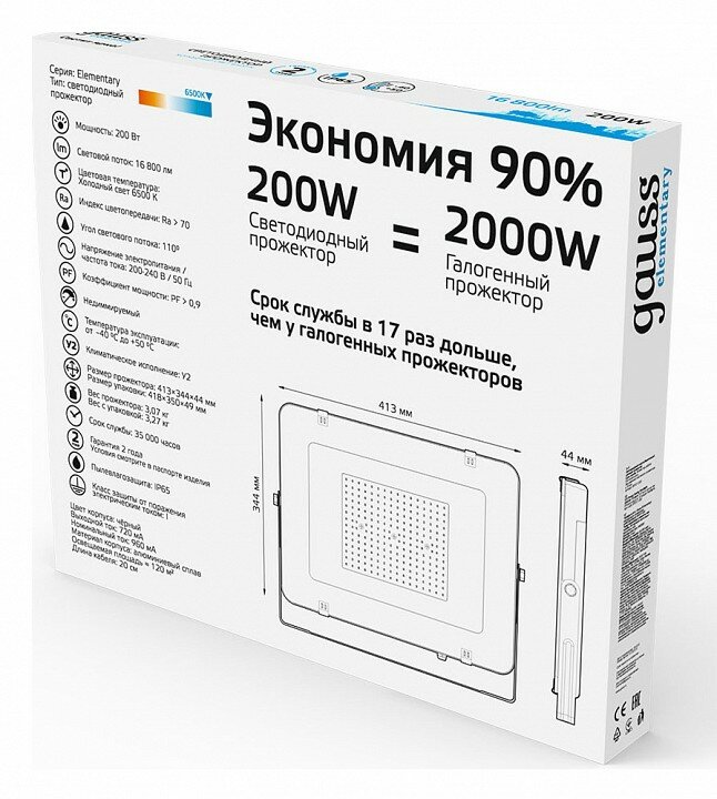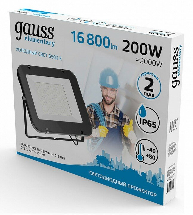 Светодиодный прожектор Gauss Elementary предназначен для наружного и ландшафтного освещения зданий, сооружений, складских объектов и больших площадей, парков, автостоянок, стадионов и объектов, требующих высокомощной подсветки. Модель является энергоэффективной заменой галогенных прожекторов, при малой мощности потребления обладает высокой светоотдачей. Материалы изготовления и конструкция прожектора обеспечивают его высокую механическую прочность и полную защиту от пыли и влаги по классу IP65.