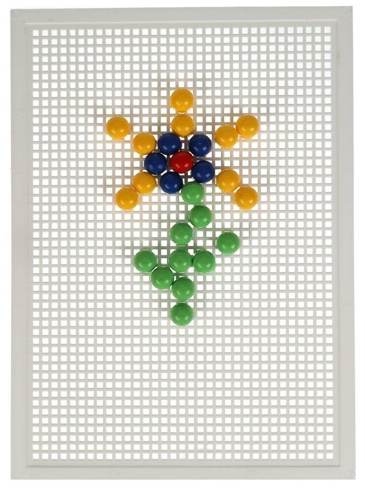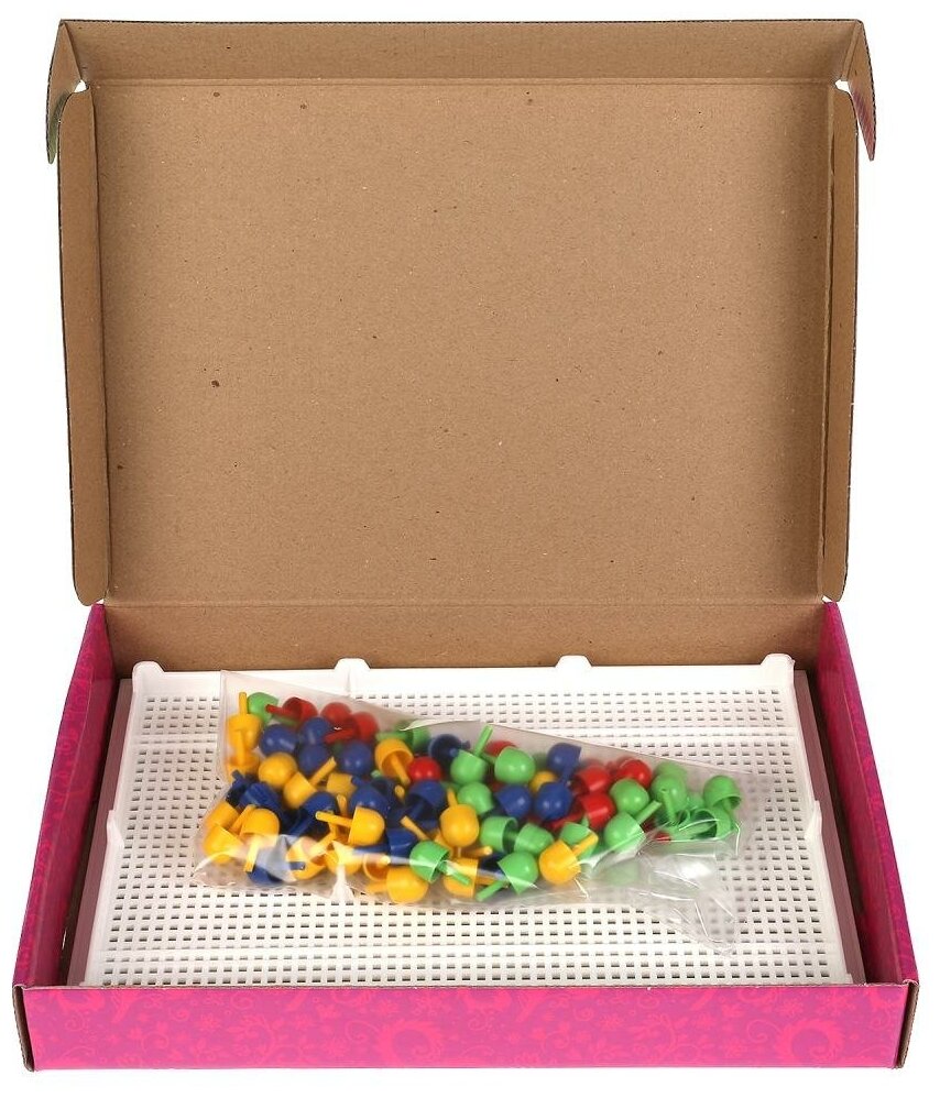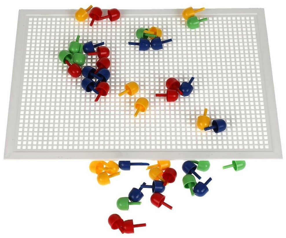 Набор состоит из основы прямоугольной формы и разноцветных пластиковых деталей из высококачественного материала, который легко моется в тёплой мыльной воде. С помощью элементов мозаики ребёнок сможет собрать самые разные варианты картинок. В качестве примера можно использовать также образцы с оборотной стороны упаковки.